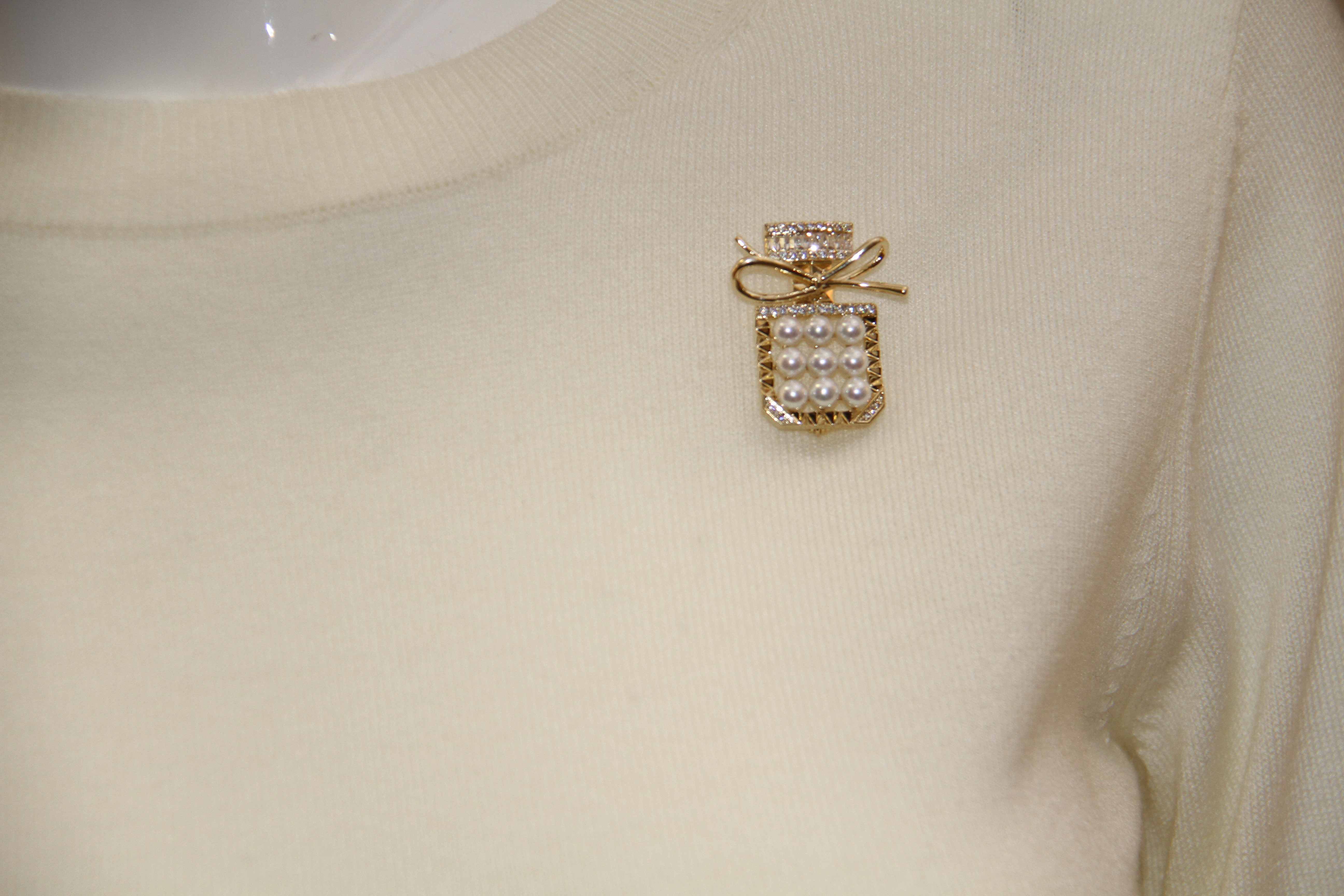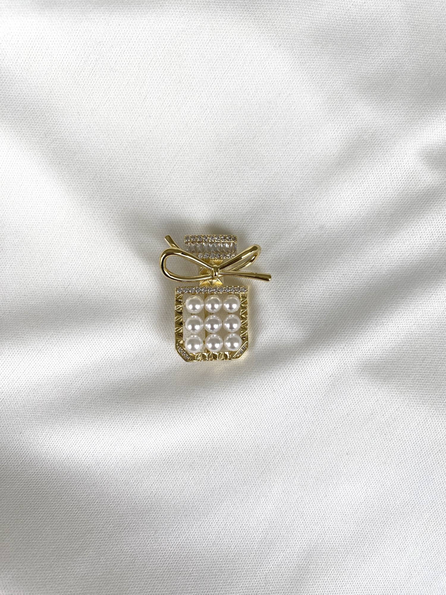 Оригинальная брошь в виде флакона с бантиком. Выполнена с использованием искуственного жемчуга.