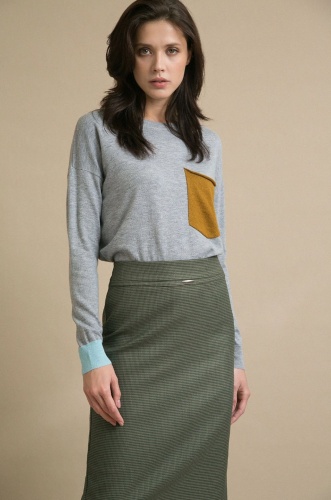 Юбка-карандаш с орнаментом "гусиная лапка". Модель имеет притачной пояс с металлическим элементом и потайную застежку-молнию сзади в среднем шве. Юбка декорирована сзади веерной складкой. Удачный выбор для создания повседневных и деловых образов.
