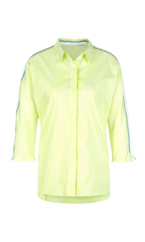 Блуза-рубашка прямого кроя. Рубашечный воротник, застежка на пуговицах, рукава 3/4, декоративная тесьма на плечах и рукавах. Приятный к телу материал из хлопковой смеси.