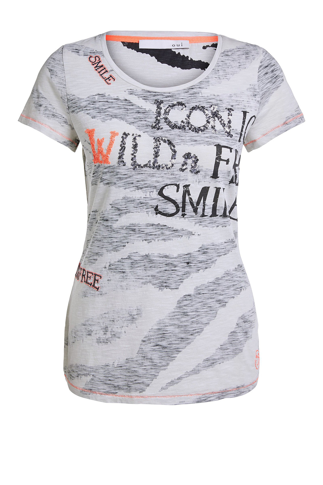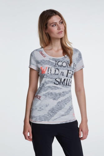 Футболка полуприлегающего силуэта с анималистическим принтом и пайетками. Круглый вырез горловины, короткие втачные рукава, декоративная отстрочка контрастного цвета. Приятный к телу хлопковый материал обеспечивает комфорт.