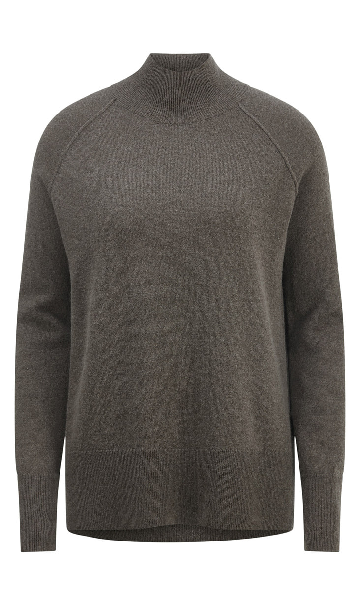 Cеро-коричневый свитер с высоким воротником-стойкой. Вязаные вточные рукава и резинка на манжетах и низе придают изделию аккуратный вид. Плотная натуральная пряжа обеспечивает тепло и уют даже в холодную погоду. Идеален для создания простого, но стильного осенне-зимнего образа.