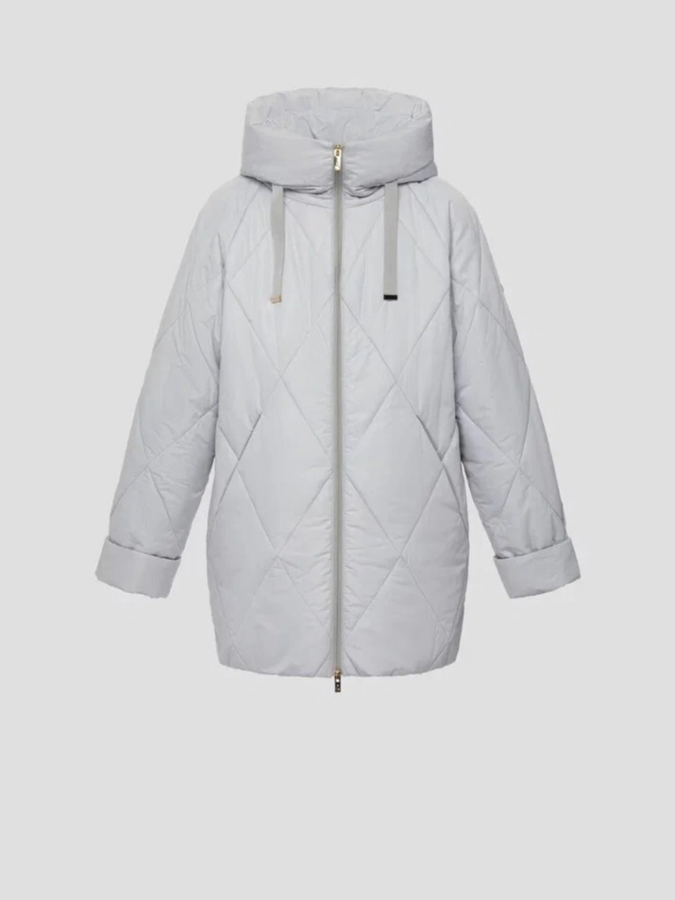 Светло-серая стеганая куртка. Регулируемые шнурки с металлическими наконечниками добавляют элемент стиля. Диагональные стеганые швы образуют изящный ромбовидный узор по всей поверхности изделия. Практичный дизайн и качественный материал делают куртку универсальной и комфортной для повседневной носки.