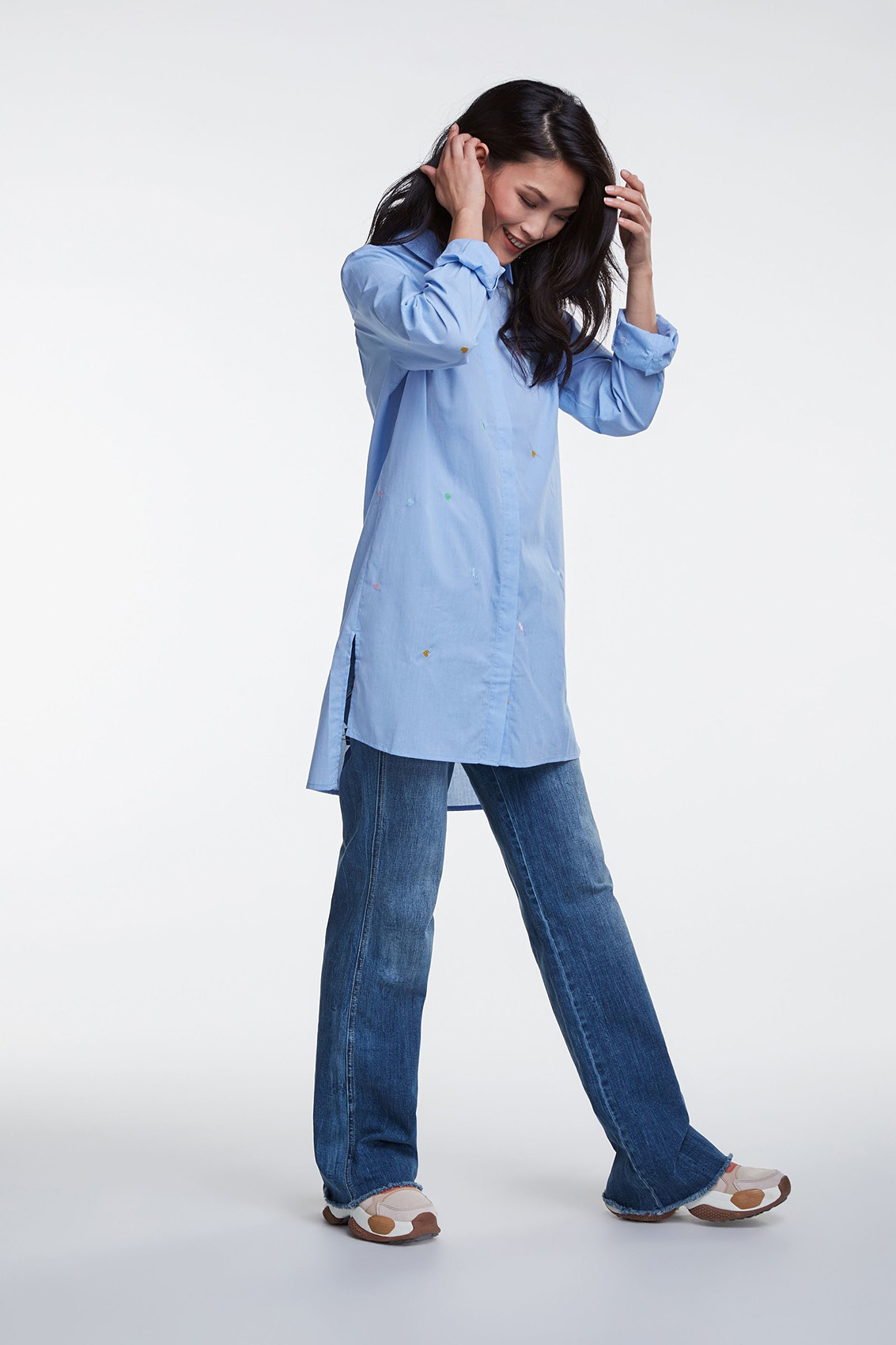Удлиненная блуза - изюминка коллекции! Прямой покрой, отложной воротничок, застежка на пуговицах, длинные рукава. Удлиненная спинка изделия, разрезы по бокам. Ткань с вышитыми элементами. Эта блуза в стиле кэжуал предполагает огромное множество модных интерпретаций.
