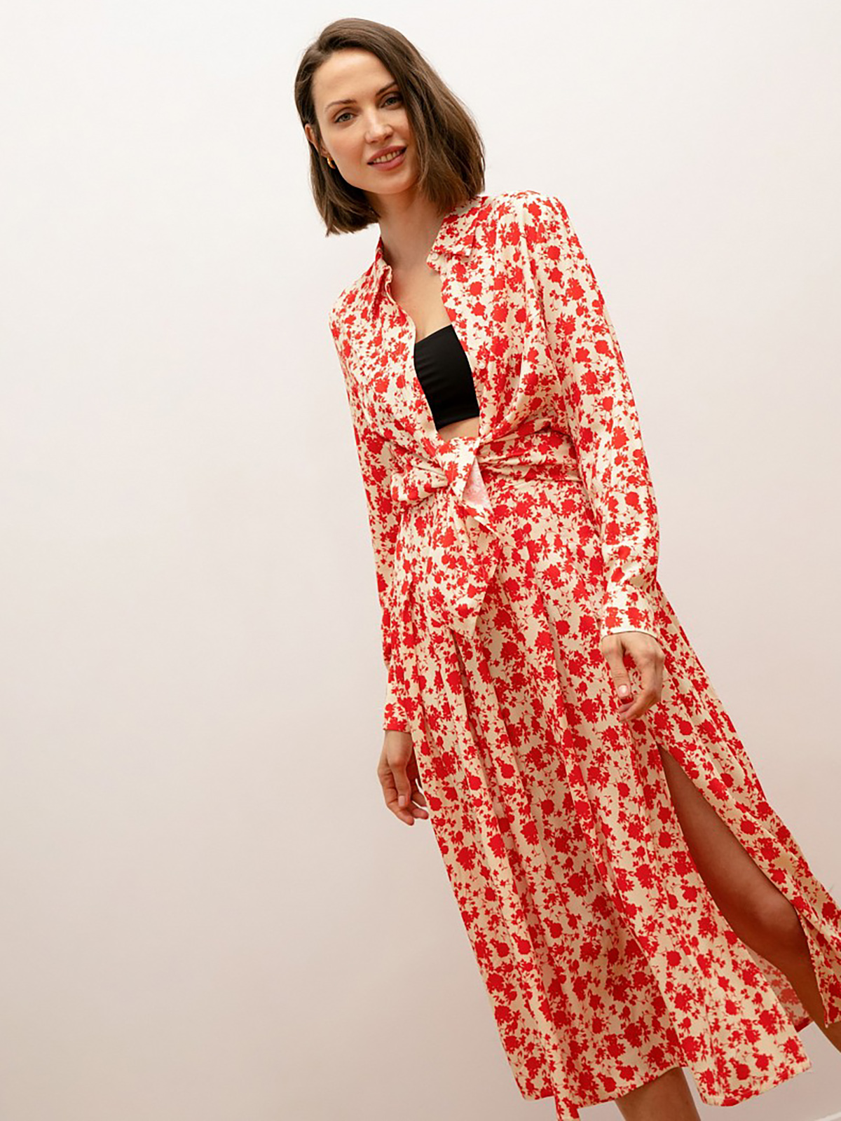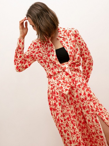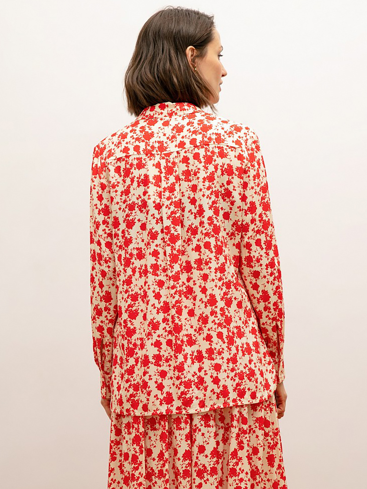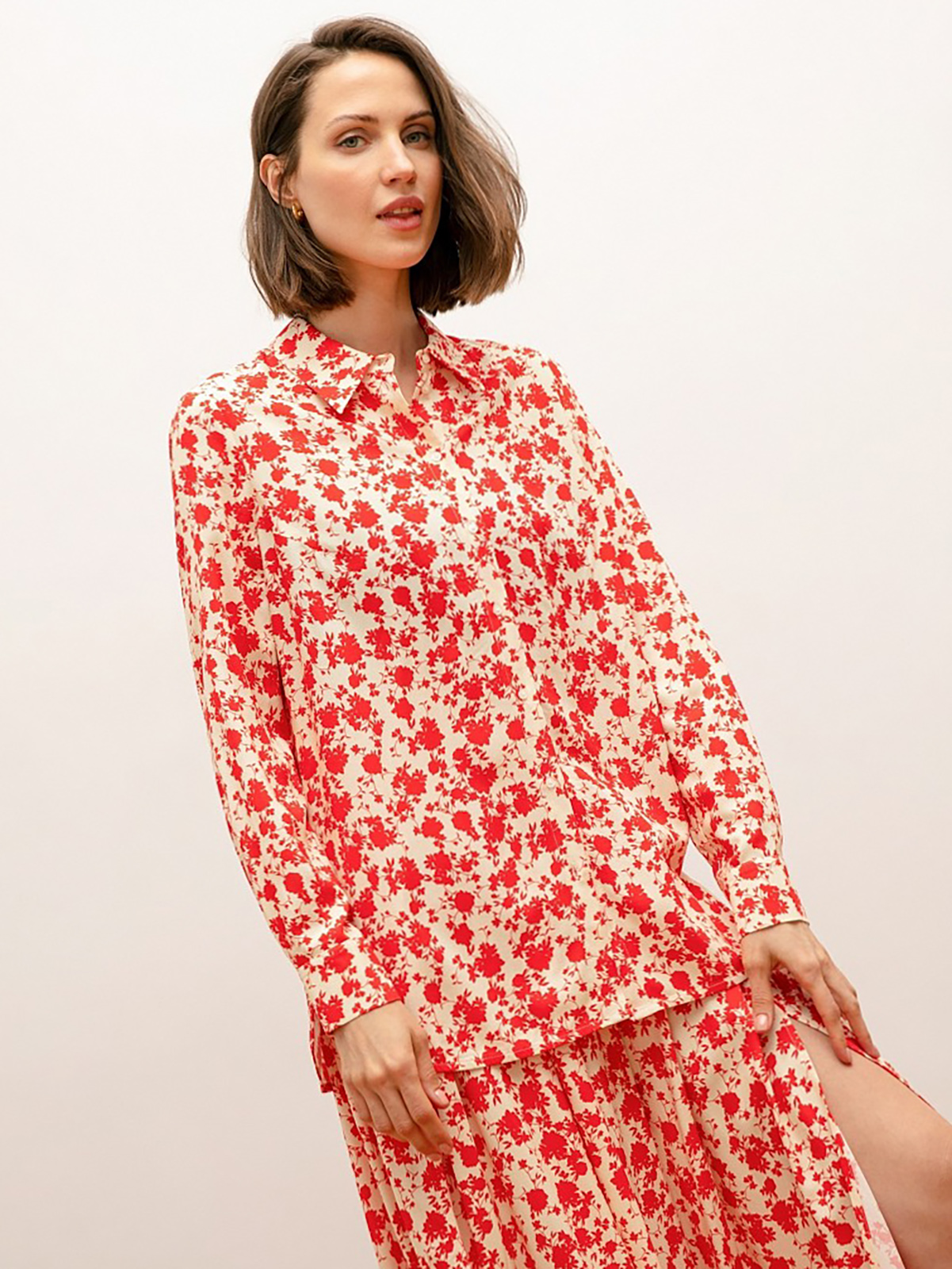 Блуза в цветочном узоре по всей поверхности. Рукав втачной с манжетой. Воротник отложной на стойке. Застежка на пуговицах.