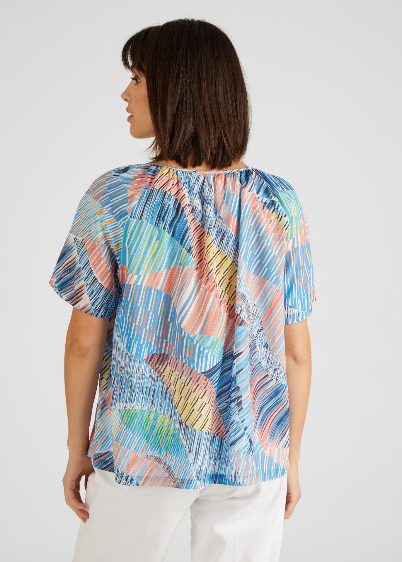 Блузка с короткими рукавами и абстрактным узоро. Небольшой V-образный вырез можно уменьшить до небольшого модного разреза с помощью ленточек на воротнике. Широкая форма придает непринужденный вид, а струящаяся ткань приятна на ощупь. Носите блузку небрежно с джинсами или брюками.