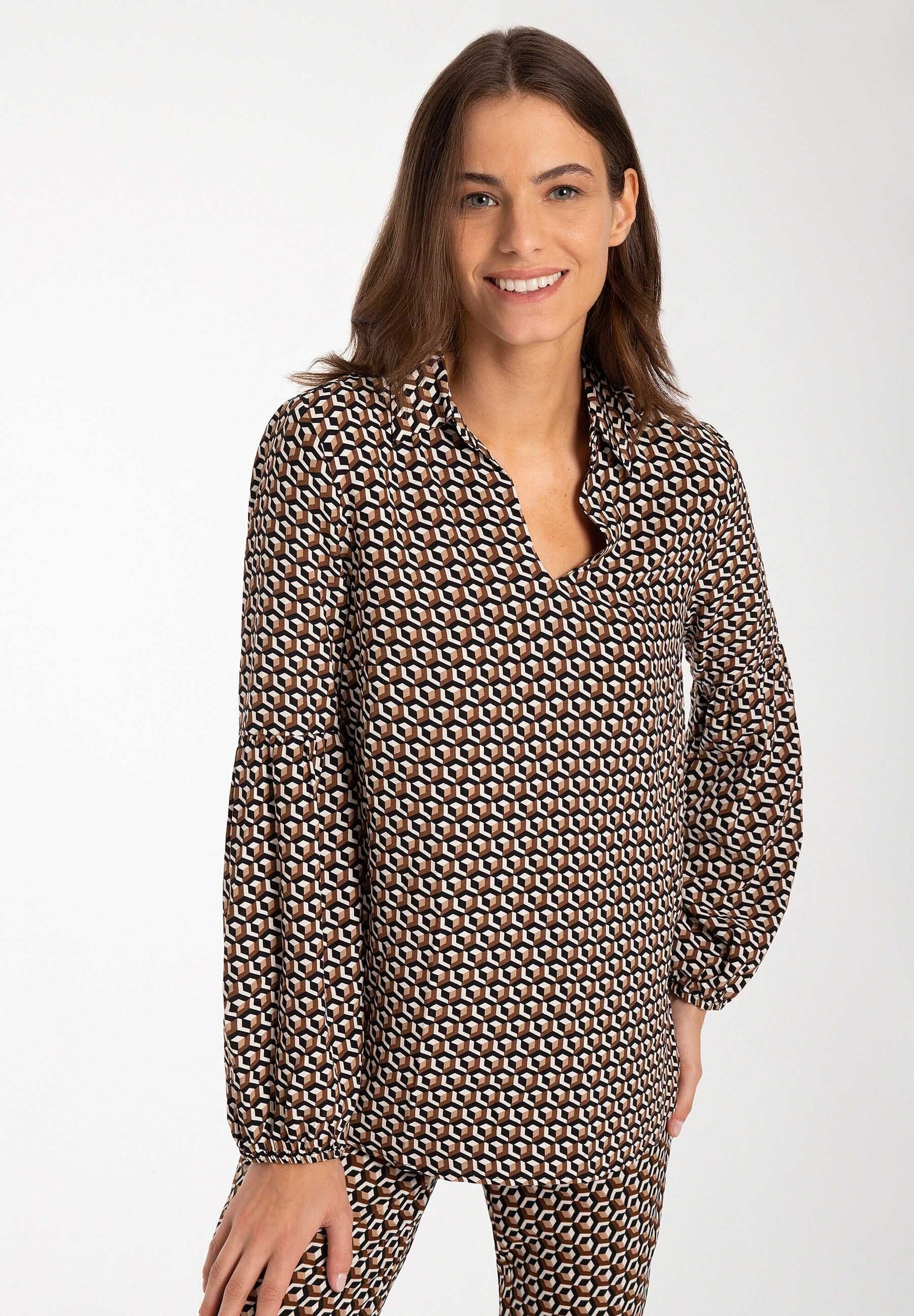 Свободная, струящаяся блузка из вискозы от MORE & MORE с графическим мини-рисунком черного/коричневого/белого цвета идеально сочетается с узкими брюками. Прямая, свободная форма, V-образный вырез с воротником рубашки, длинные рукава со сборками по швам и эластичными концами, графический мини-узор черного/коричневого/белого цвета. Длина по размеру 42 = 68см
