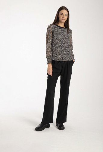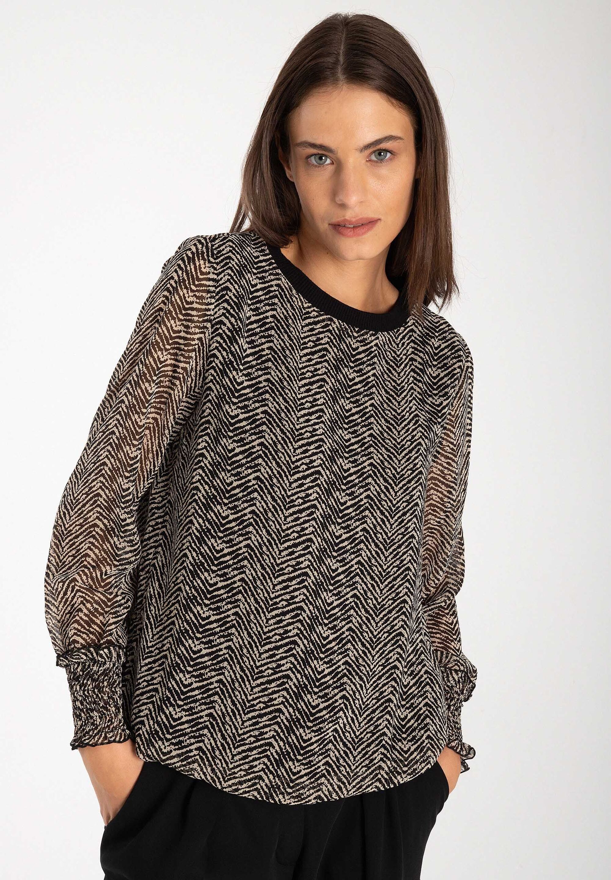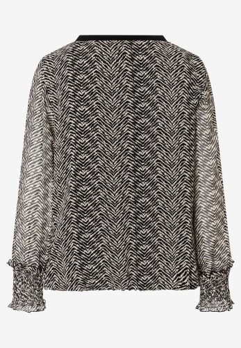 Струящаяся шифоновая блузка с двухцветным зигзагообразным принтом и спортивными ребристыми манжетами на вырезе одинаково хорошо смотрится с денимом с покрытием или классическими деловыми брюками. Длина по размеру 42 - 62 см.