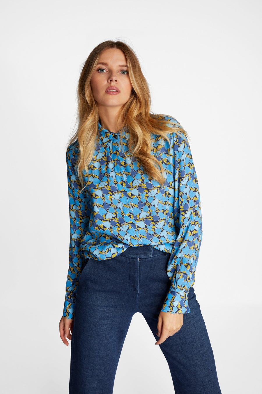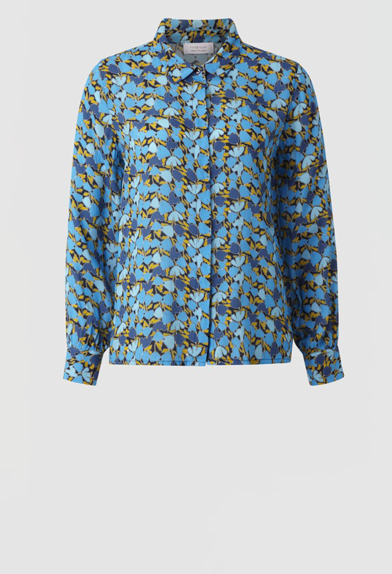 Рубашка свободного кроя украшена ярким акварельным принтом на мягкой струящейся вискозе из переработанных материалов. Модель с классической планкой на пуговицах и воротником.