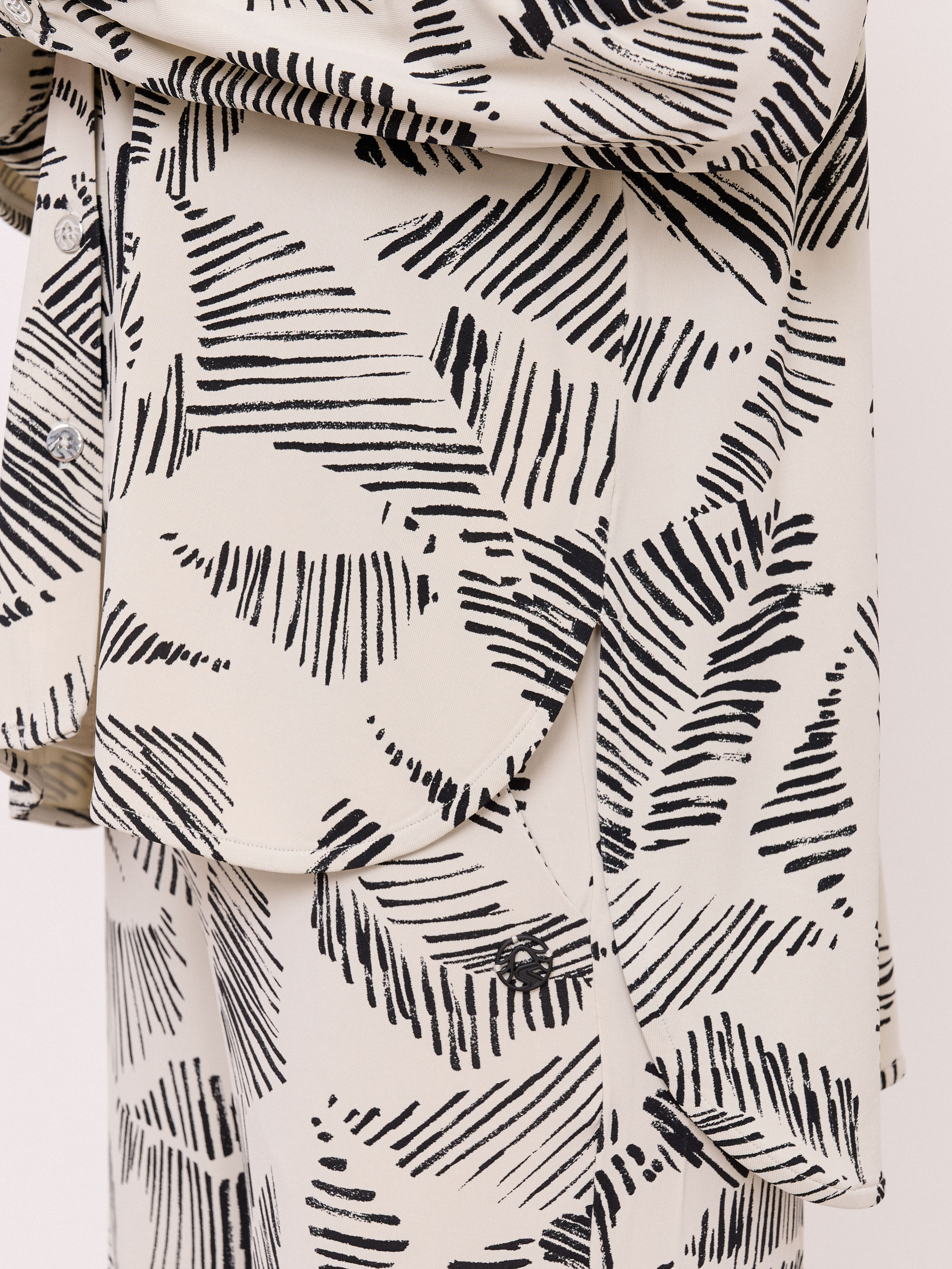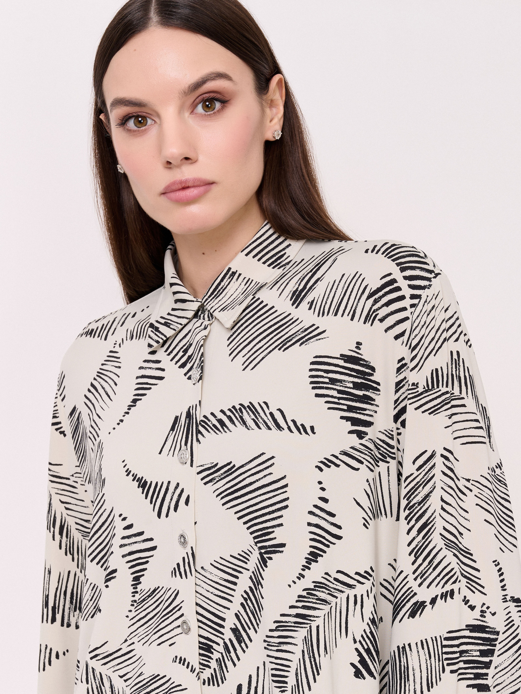 Детали: застежка пуговицы, вырез горловины отложной воротничок, рукава длинные, покрой рубашечный, рисунок абстракция. Длина по спинке: 74 см.