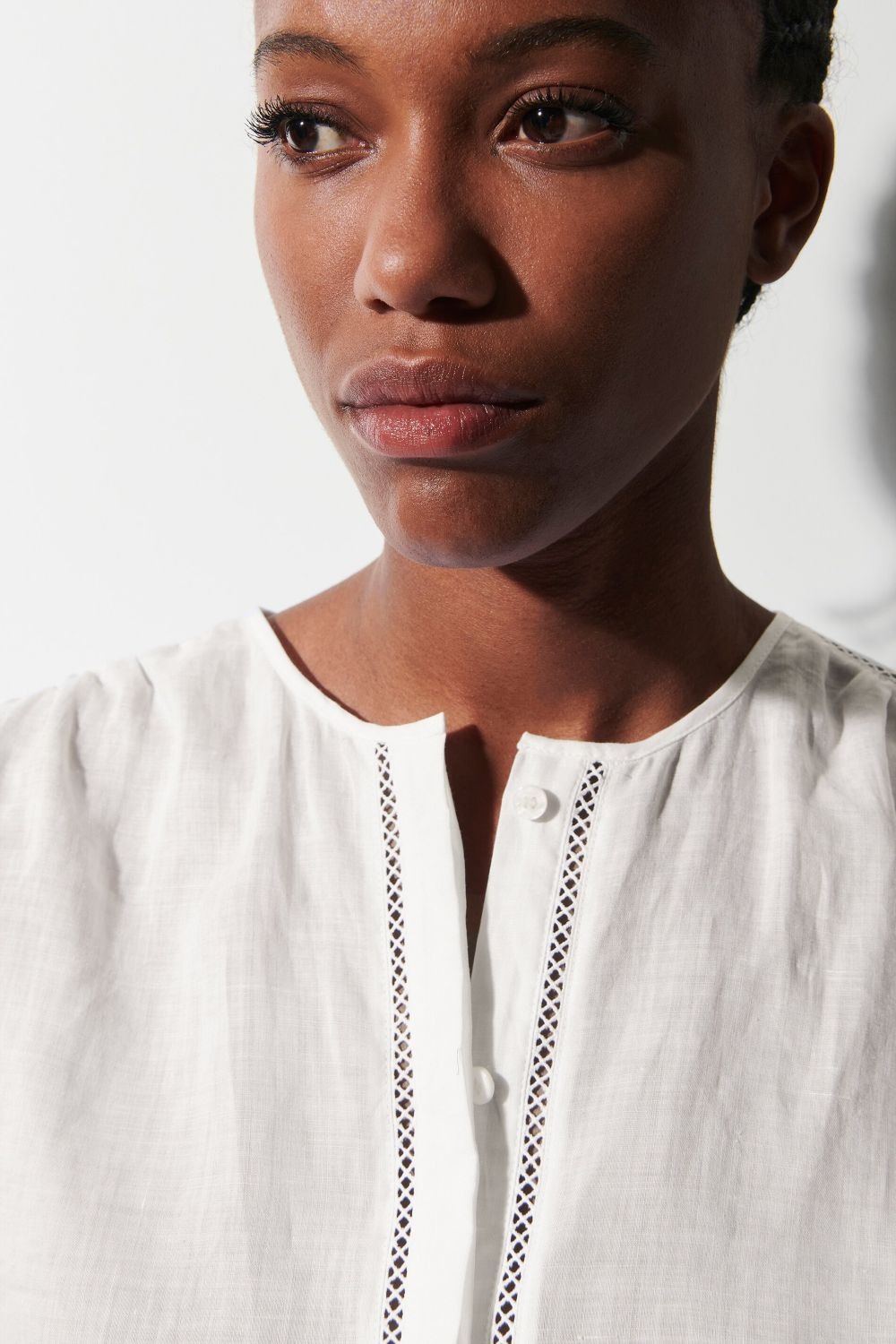 Блузка без воротника из элегантной непрозрачной ткани рами с ажурными деталями и планкой на потайных пуговицах. Широкие рукава с узкими манжетами на одной пуговице, тонкие рюши возле плеч и закругленный низ завершают образ.