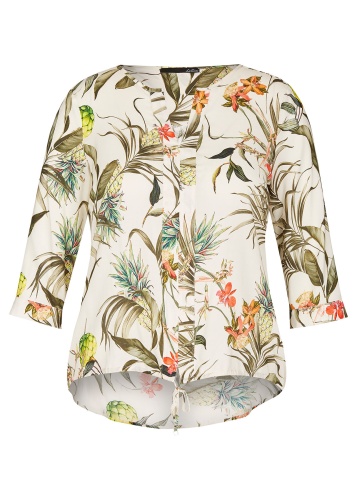 Блуза с трендовым тропическим принтом. Фигурный вырез горловины, рукав 3/4, кулиска по низу изделия, удлиненная спинка. Приятный к телу вискозный материал.