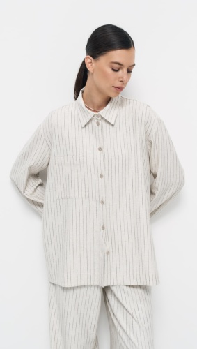 Блуза выполнена из ткани в полоску с содержанием льна, что придает изделию натуральность и текстурность. Цвет "льняной пергамент" добавляет модели нейтральности и универсальности.