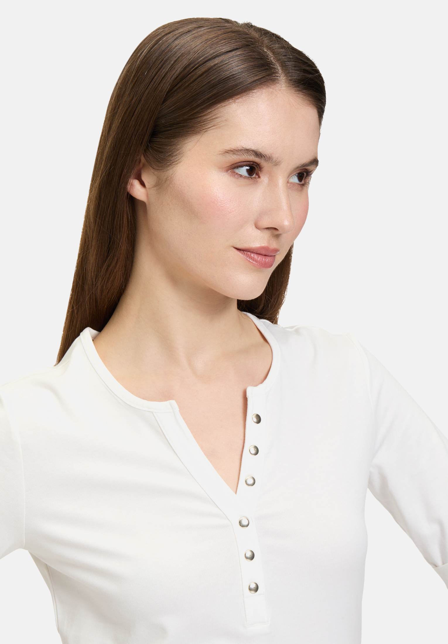 Слегка приталенная базовая рубашка с короткими рукавами и круглым вырезом впечатляет своим простым однотонным дизайном. Планка с пуговицами добавляет дополнительный акцент и придаёт рубашке современный вид. Облегающий крой выгодно подчеркивает фигуру и делает её идеальным повседневным предметом гардероба, который можно комбинировать с различными образами.