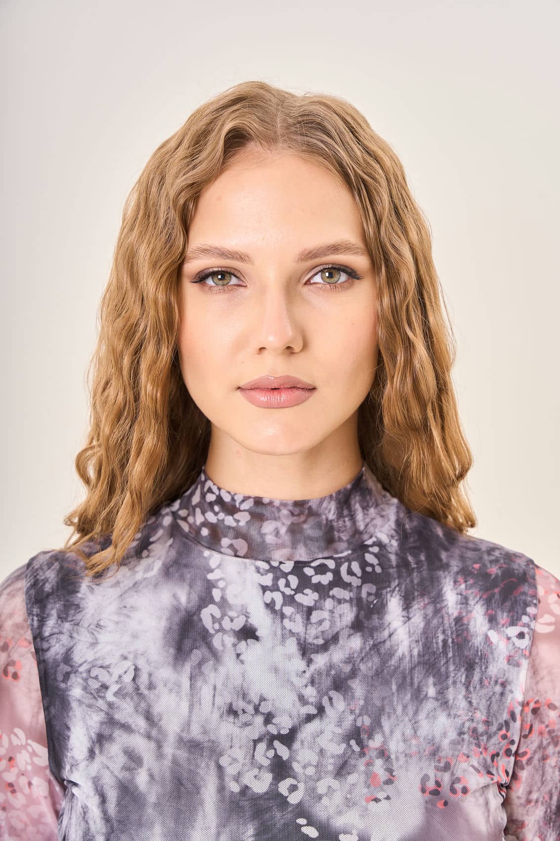 Женская облегающая блузка с длинными рукавами и воротником-стойкой. Сложная цветовая гамма с размытыми пятнами серого, белого и розового оттенков создает глубину и выразительность. Мелкий принт в виде леопардовых пятен, выполненный в различных оттенках розового и серого, добавляет изделию уникальности и стиля. Натуральная ткань приятно прилегает к коже, подчеркивая красоту фигуры.Осень-Зима'25/26. Капсула "Вишневый сад"
