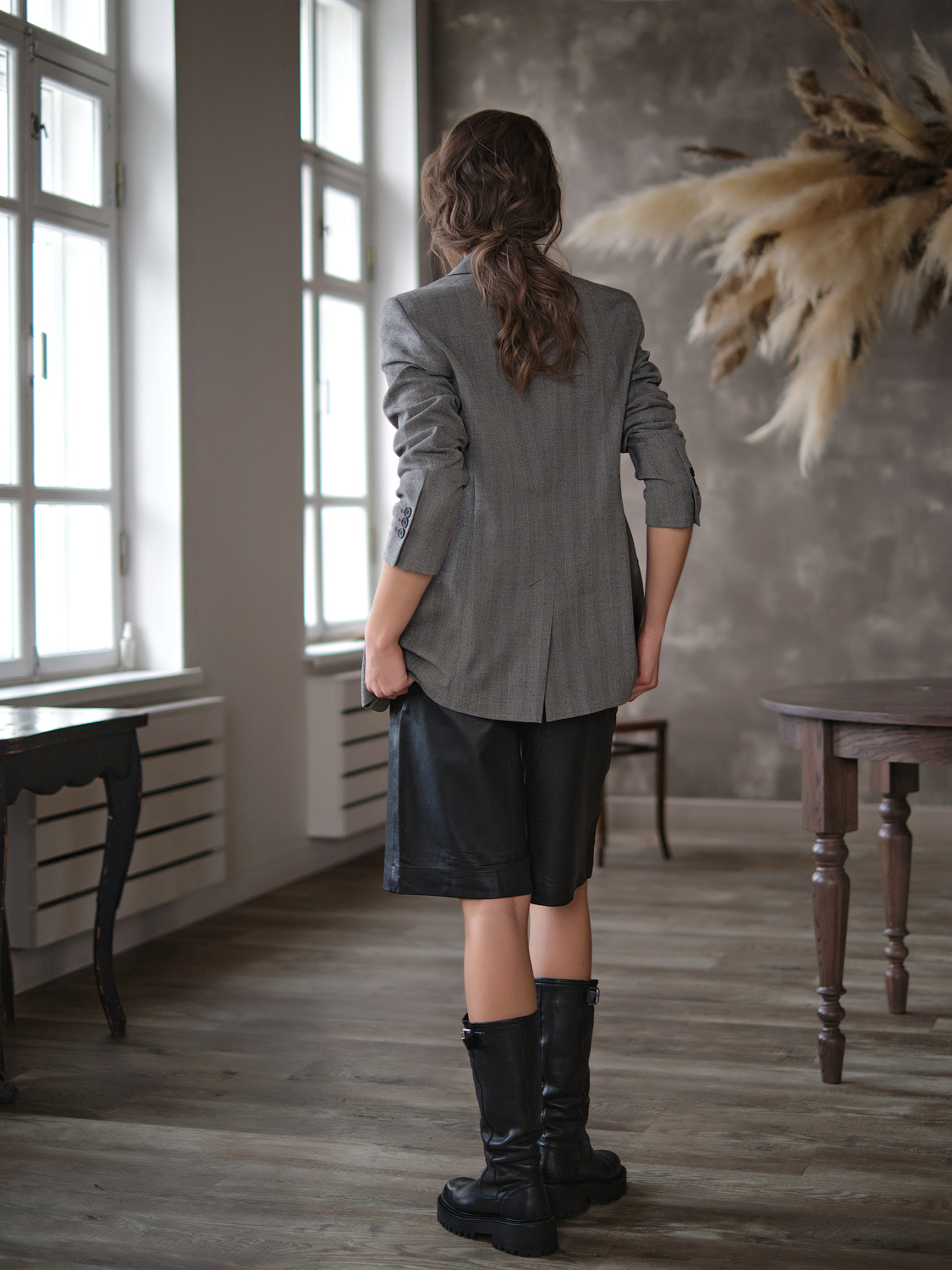 Экстравагантные кожаные шорты могут стать яркой акцентной деталью в совокупности со сдержанным верхом. Смелый и невероятно стильный атрибут гардероба по-настоящему стильной женщины. Свободный силуэт, длина до колена, эластичный пояс на кулиске.