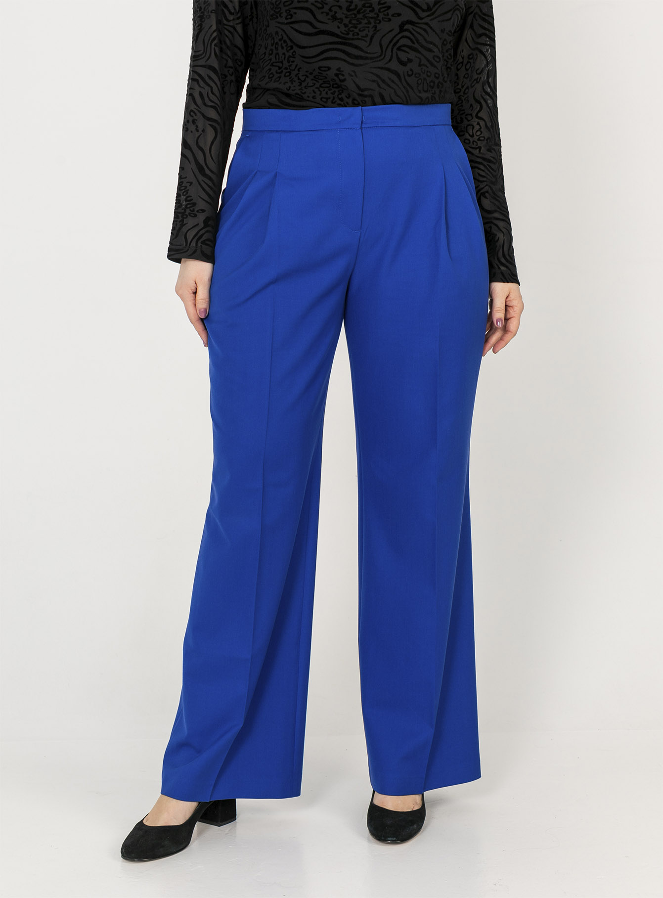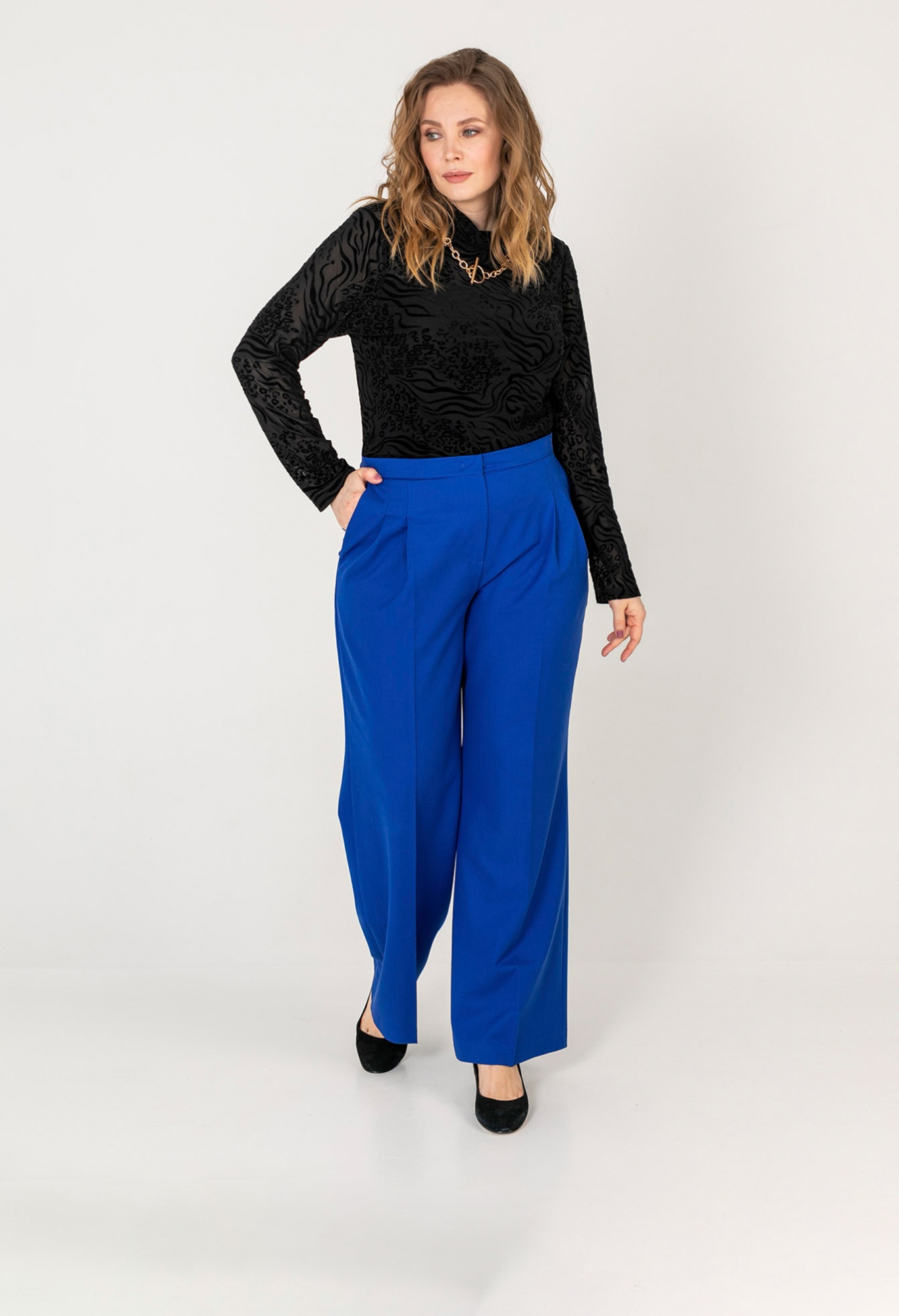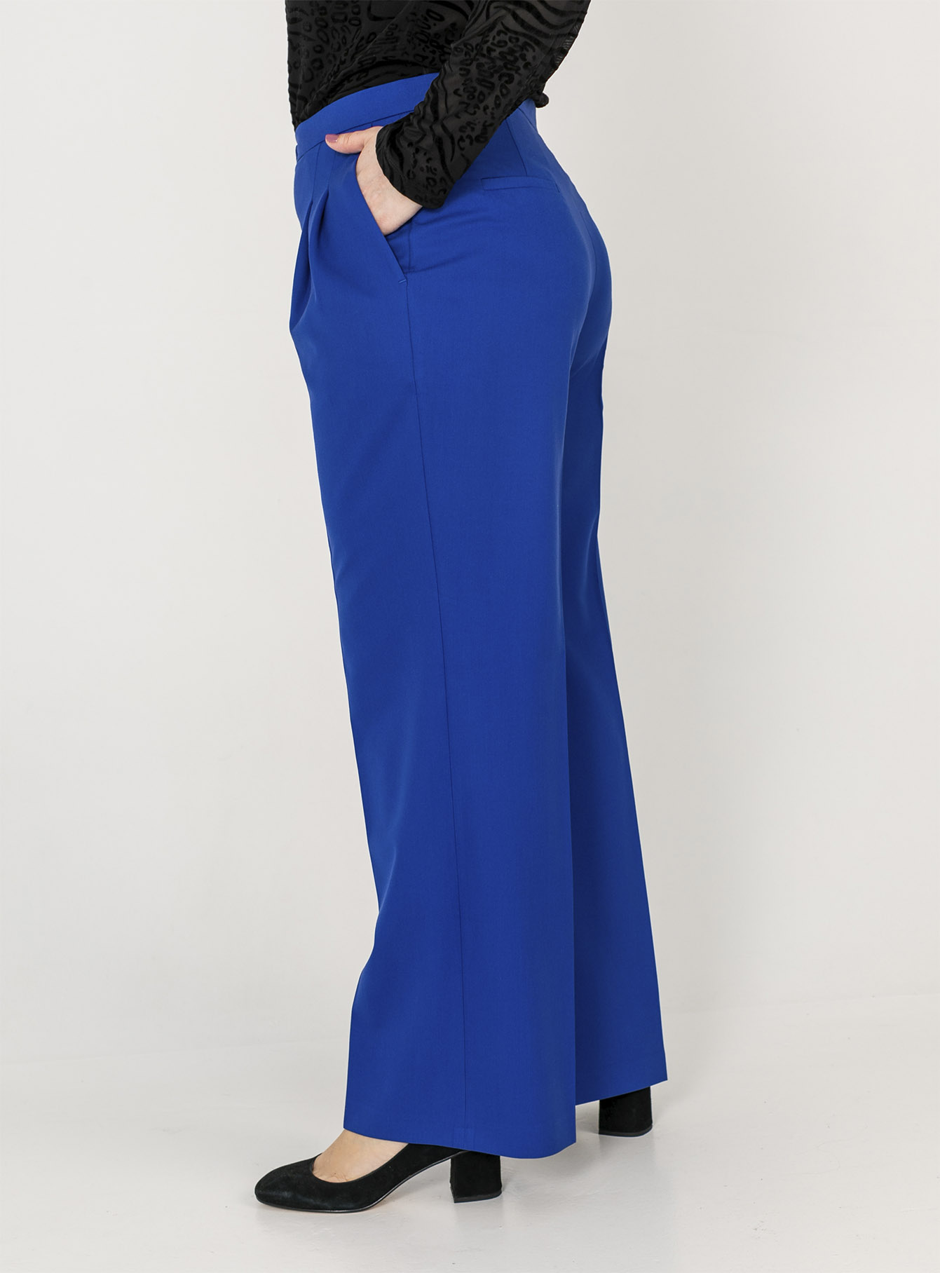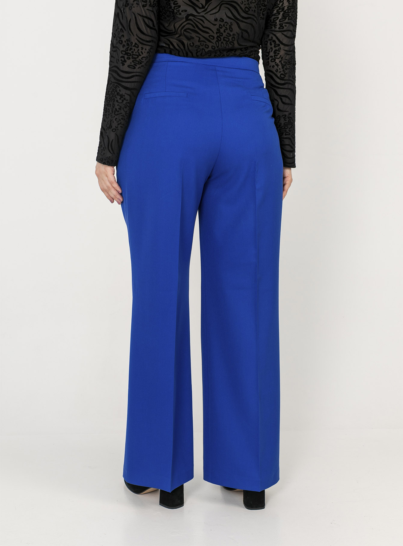 На сайте указаны российские размеры. Ткань: смесовый состав, практичный и комфортный в носке (22% вискоза, 72% полиэстер, 6% эластан). Крой: невероятно женственные, прекрасно подчеркивающие достоинства и скрывающие недостатки, расклешенные брюки с высокой посадкой. Ультрамодный оттенок электрик, изящные защипы в области функциональных карманов и строгая стрелка, создающая дополнительную вертикаль – все эти детали сделают образ запоминающимся и ярким. Свободный летящий силуэт создает романтичное настроение и дарит комфорт при движении. Отделка: застегиваются на молнию и скрытую застежку. Сзади расположены два прорезных кармана.