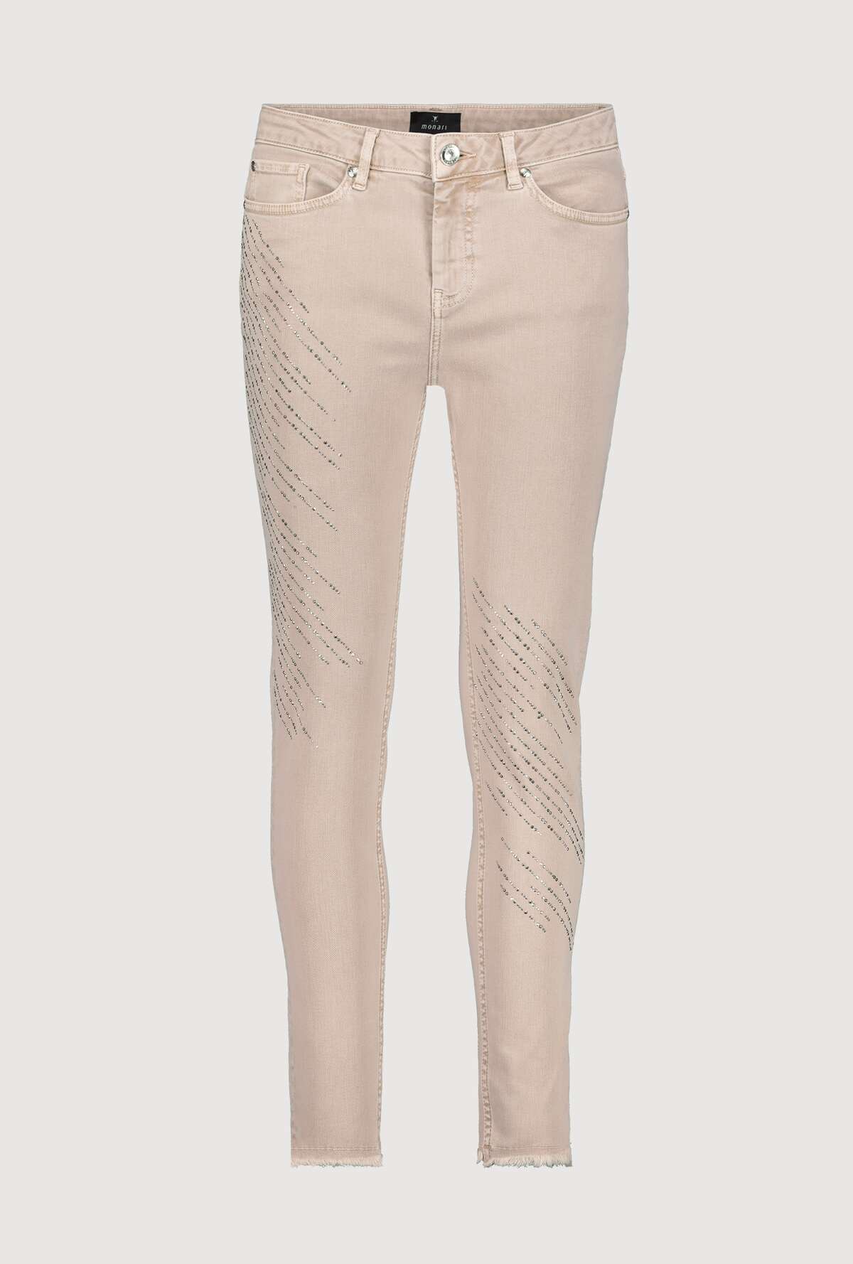 На сайте указаны российские размеры. Узкие джинсы с пятью карманами и эффектными стразами. Узкий крой с петлями для ремня на поясе, классическая посадка и пять карманов. Низ штанин украшен стильной бахромой, а сверкающие полоски со стразами эффектно украшают модель. Параметры модели: 42 размер, рост 179 см