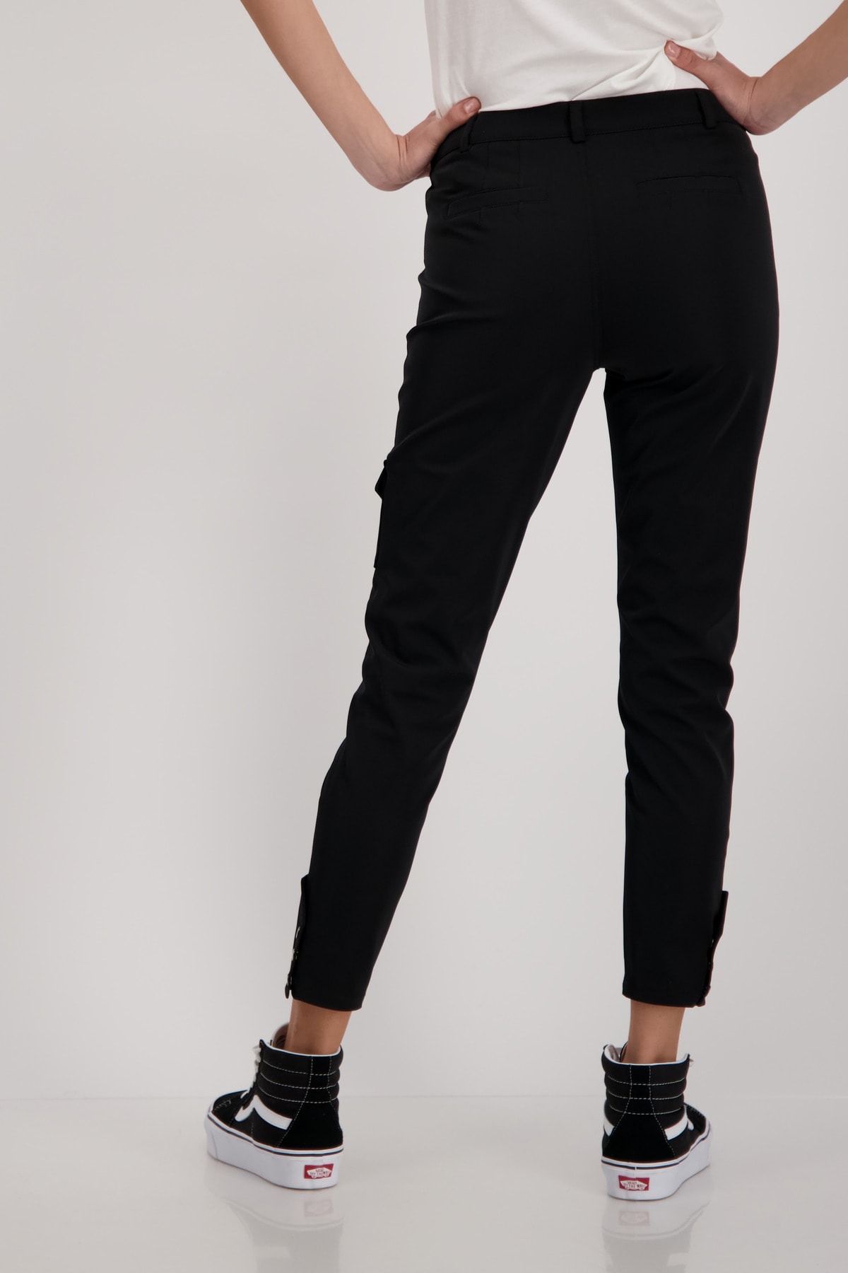 На сайте указаны российские размеры. Черные брюки с подворотами зауженного кроя. Чрезвычайно эластичное и простое в уходе качество. Благодаря высокому содержанию эластана в штанах так же легко двигаться, как и в спортивных штанах. Прямой пояс с петлями для ремня, пуговицей и потайной молнией. Передняя часть имеет боковые прорезные карманы со потайной молнией, горизонтальные и вертикальные разделительные швы и накладной карман с клапаном на уровне колена. Разрез со вставкой и декоративная планка на кнопках украшают штанины. Рост модели 179 см