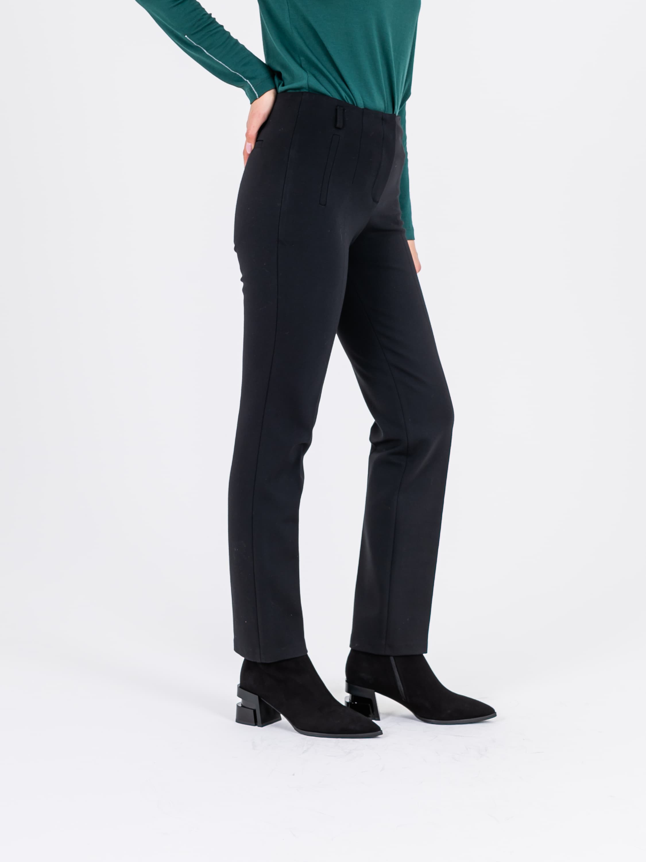 На сайте указаны российские размеры. Классические брюки со стрелками и завышенной талией на скрытой пуговице. По 2 имитированных кармана спереди и сзади. Ткань: костюмная ткань средней плотности (62% нейлон, 35% вискоза, 3% эластан). Не мнется в процессе носки. Крой: неоклассическая модель брюк со средней посадкой, прикрывающей зону живота. Прямой облегающий силуэт подчеркивает достоинства фигуры, а стрелка создает вертикаль, которая визуально корректирует возможные недостатки в области бедер. Брюки имеют стандартную длину, их можно носить с различной обувью – на плоском ходу или на каблуке. Отделка: сдержанная модель, которая не нуждается в дополнительных элементах отделки. Сзади есть два декоративных кармана, а сверху – шлевки для тонкого ремешка или платка. Рост моделм 173 см