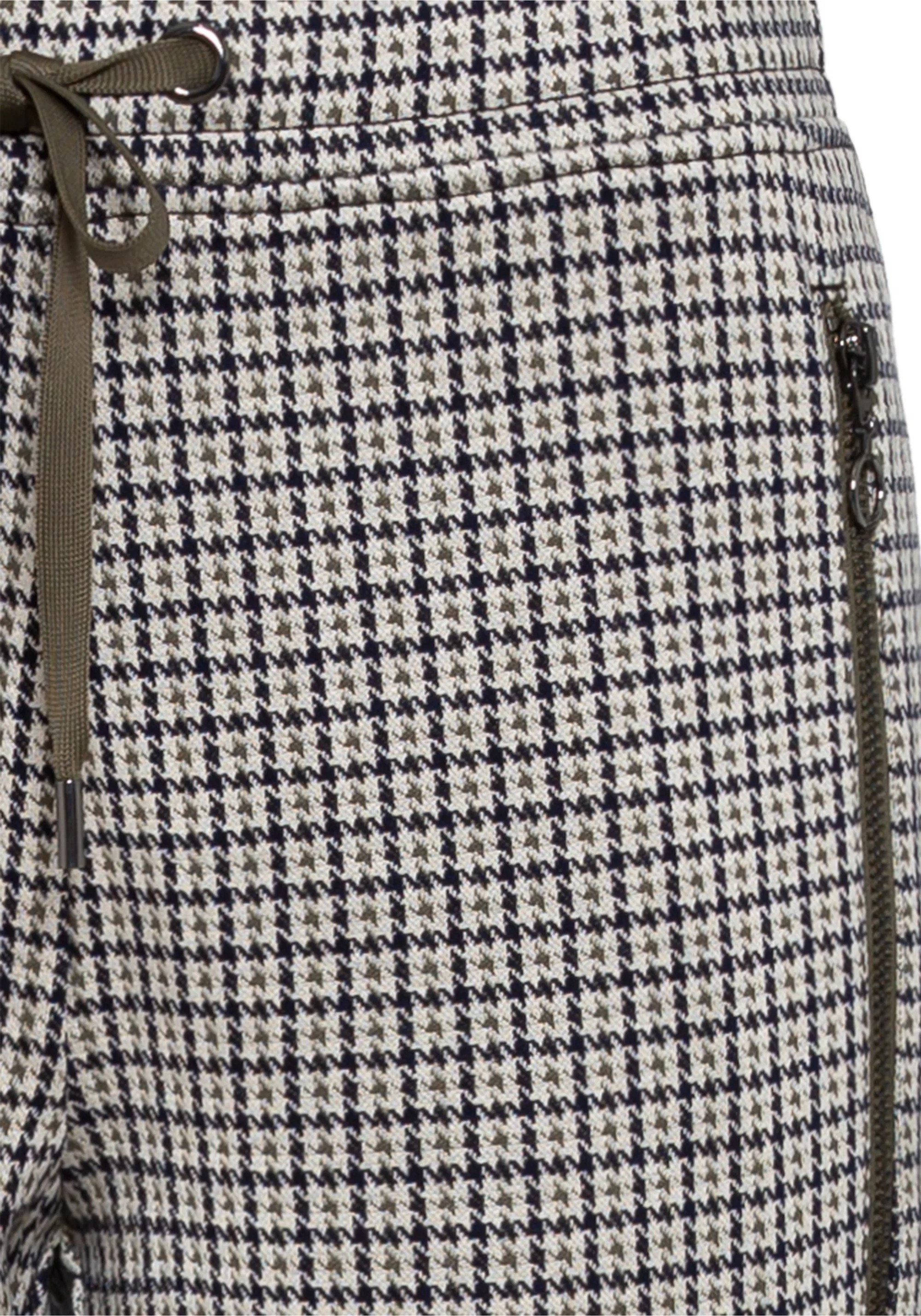 На сайте указаны российские размеры. Брюки средней посадки в ломаную клетку, регулируемые тесьмой на талии. Боковые карманы на молнии и прорезные карманы сзади. Слегка зауженная штанина с резинкой. Длина: 72 см в 44 размере.