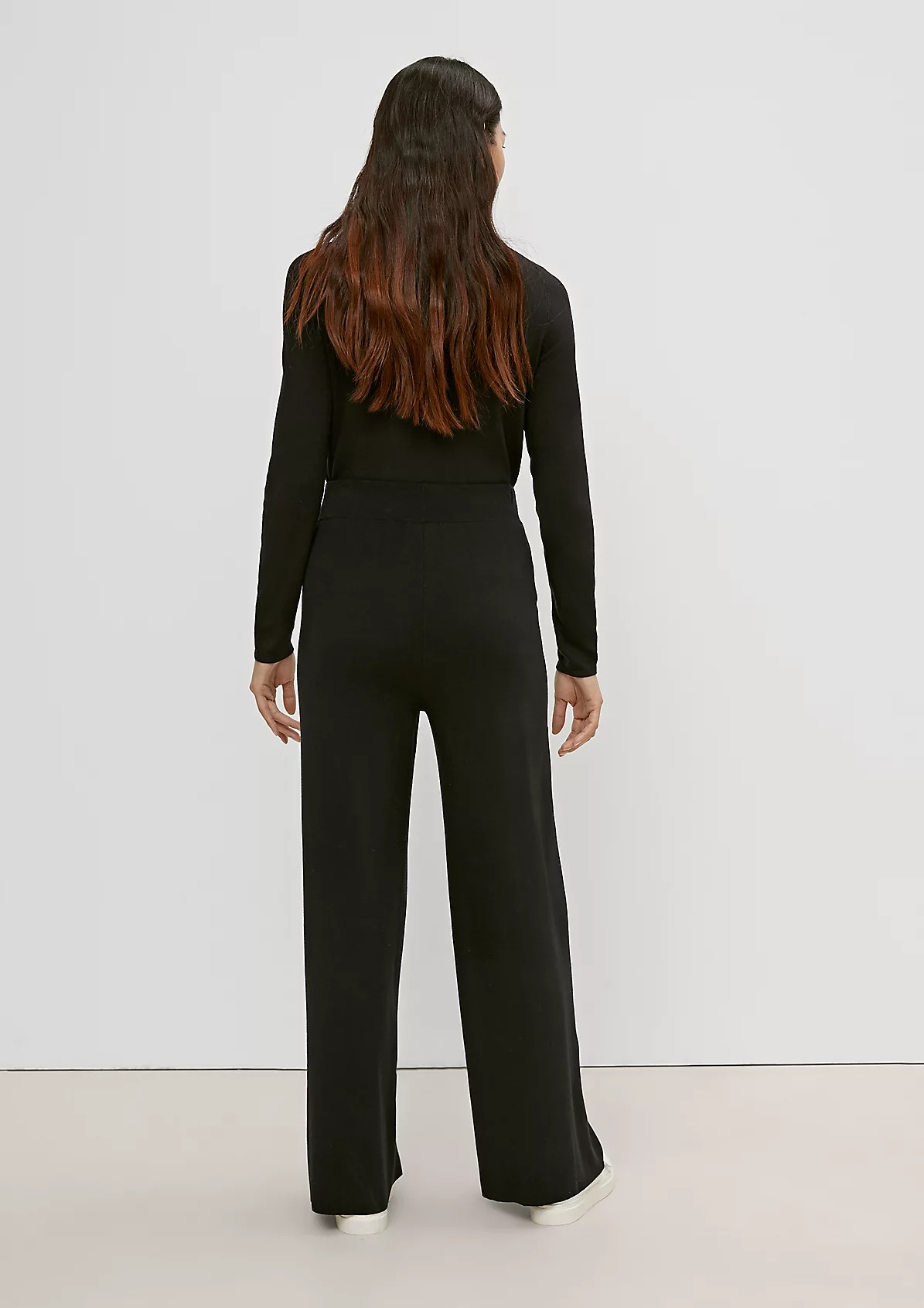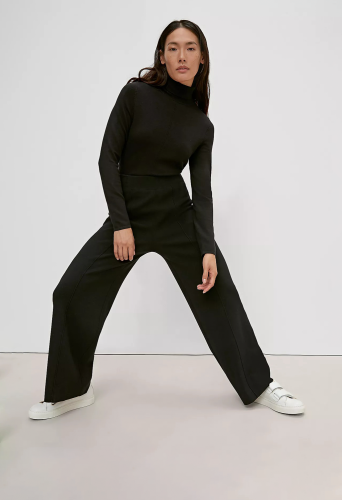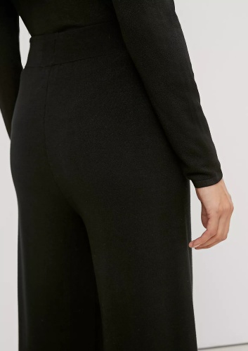 На сайте указаны российские размеры. Брюки-кюлоты из тонкого трикотажа прямой формы. Пояс на резинке. Внутренняя длина штанины составляет около 76 см для размера 42. Рост модели 175 см.