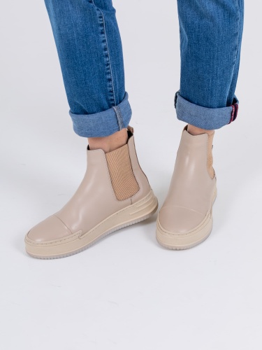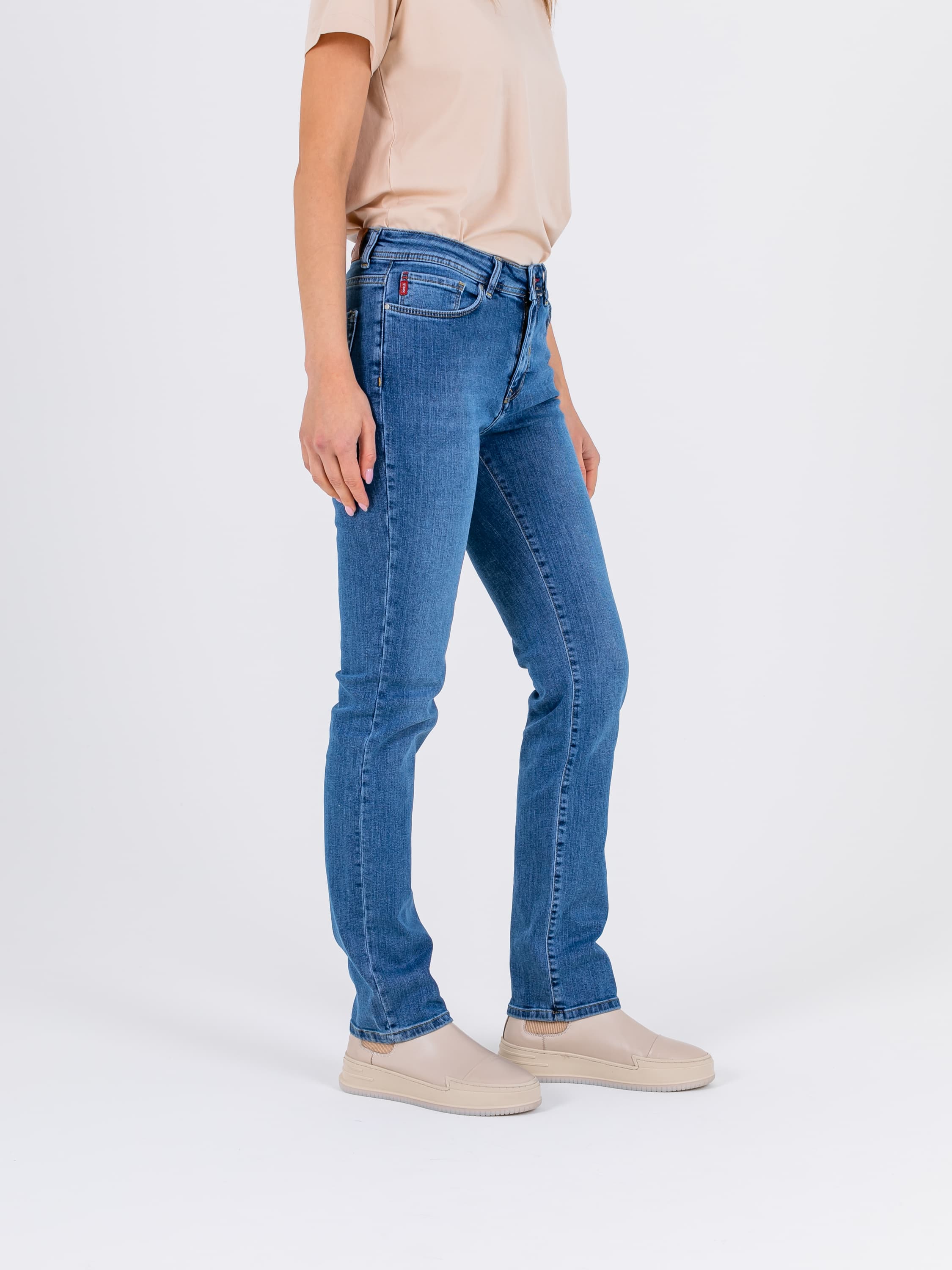 Длинные джинсы «Slim Fit» с застежкой на молнию и 1 пуговицу. Джинсы слегка зауженные книзу, с легким варёным эффектом. На передних половинках расположены два кармана с отрезным бочком и один монетный карман. На задних половинках два накладных кармана с декоративными горизонтальными швами и фигурная кокетка. Верх брюк обработан поясом со шлевками.