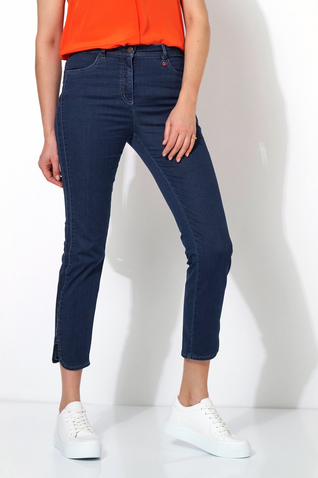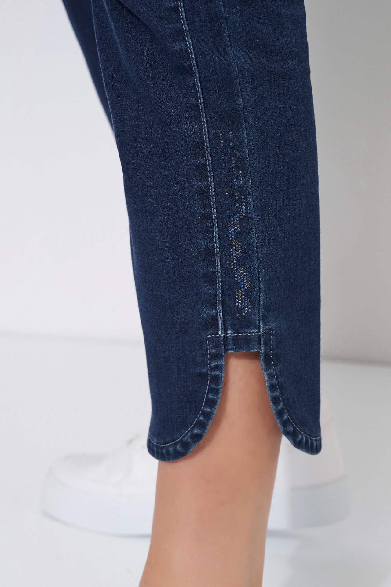 На сайте указаны российские размеры. Облегающие укороченные джинсы со стразами на голени, изысканным подолом, двойными боковыми швами и из легкой джинсовой ткани. Высокая посадка. Рост модели 180 см.