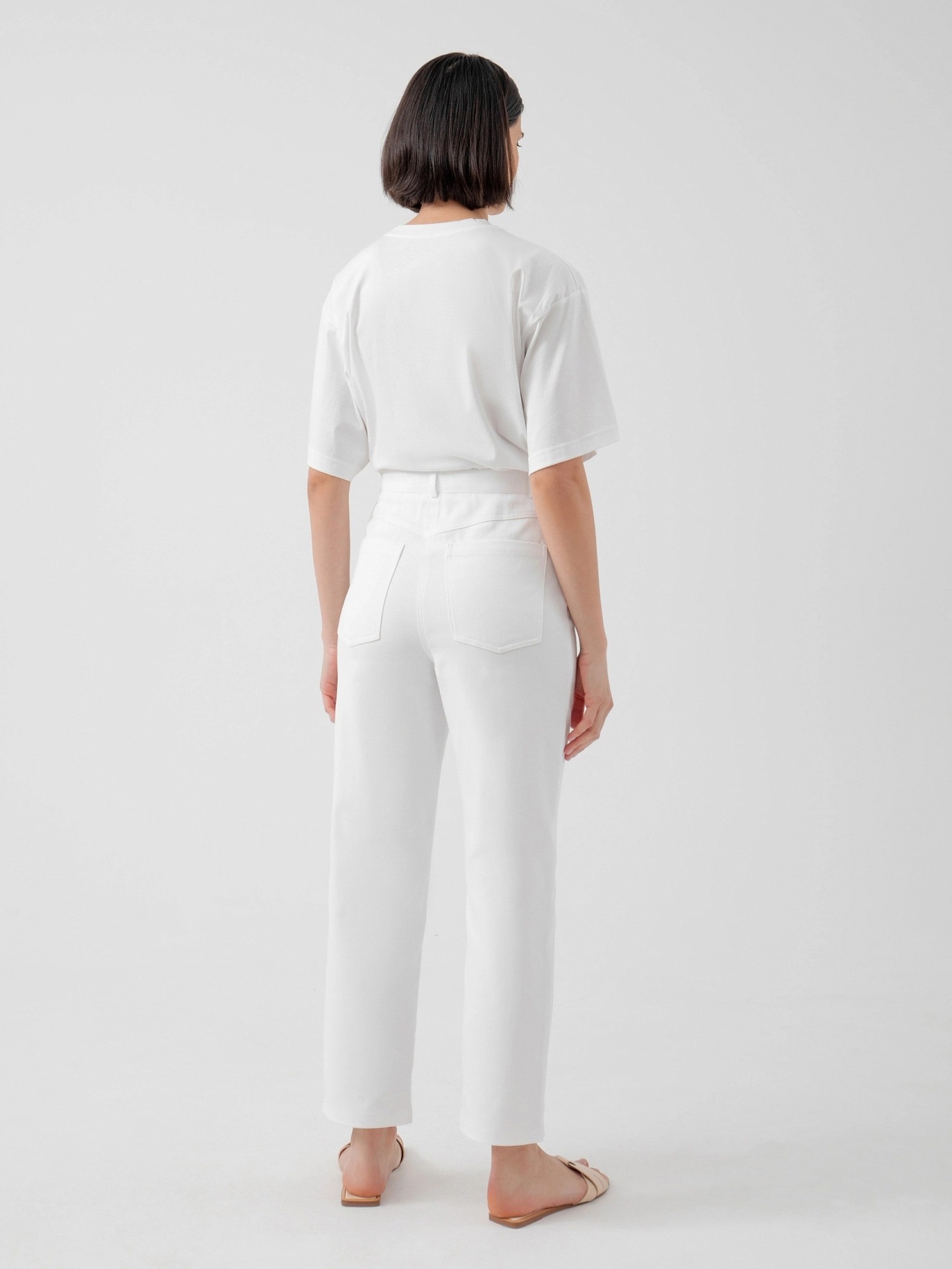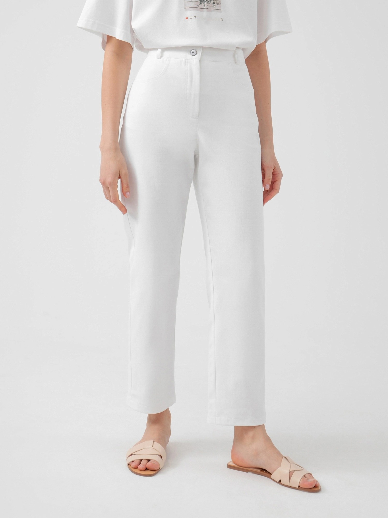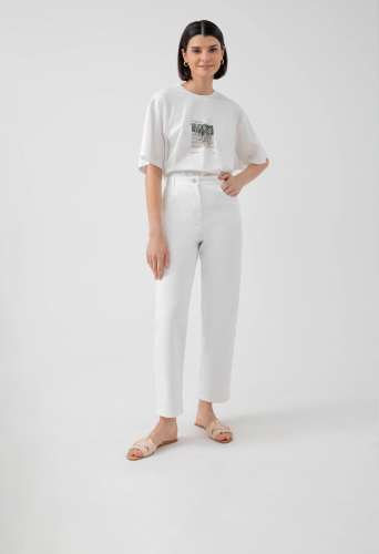 На сайте указаны российские размеры. Брюки прямого силуэта на притачном поясе со шлевками и фигурными рабочими карманами. Застежка спереди на молнию и пуговица. Сзади фигурная кокетка и крупные накладные карманы. Рост модели 175 см.