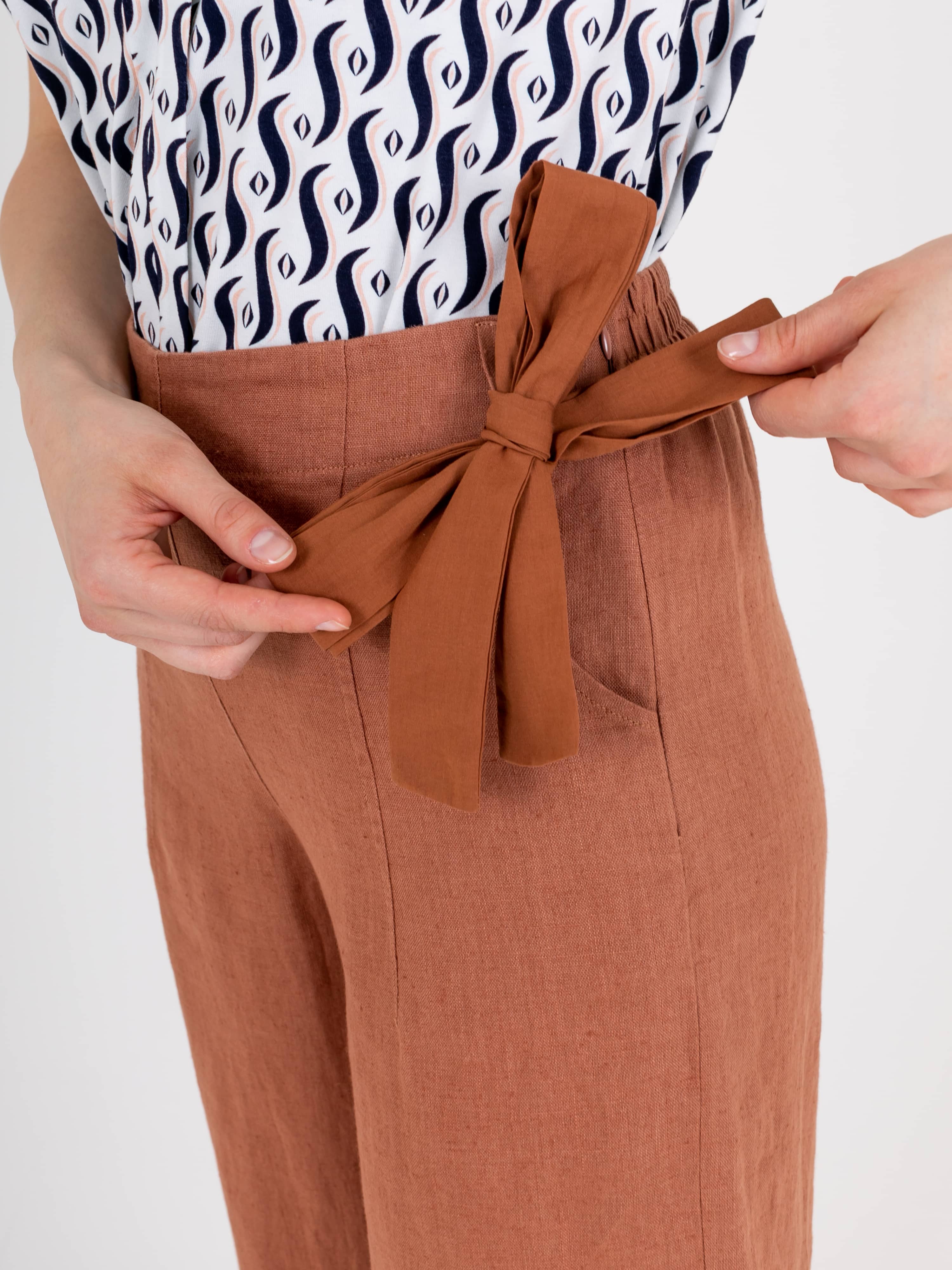 Укороченный прямые брюки, длиной до щиколоток «трубы» с застежкой на молнию в боковом шве из натурального льна. На передних половинках расположены два кармана с отрезным бочком. Верх брюк обработан поясом на резинке и со шлевками, также есть съемный пояс.