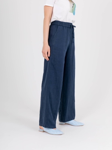 Прямые удлиненные брюки «трубы» из натурального льна. На передних половинках расположены два кармана с отрезным бочком. На задних половинках брюк расположены накладные карманы. Верх брюк на резинке со шнуром для регулировки объема.