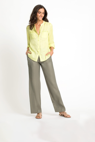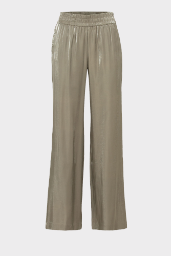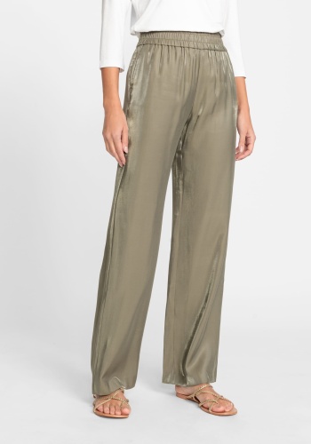 Брюки из вискозной ткани создают ощущение воздушности на коже. Удобство благодаря широкому эластичному поясу и двум прорезным карманам.