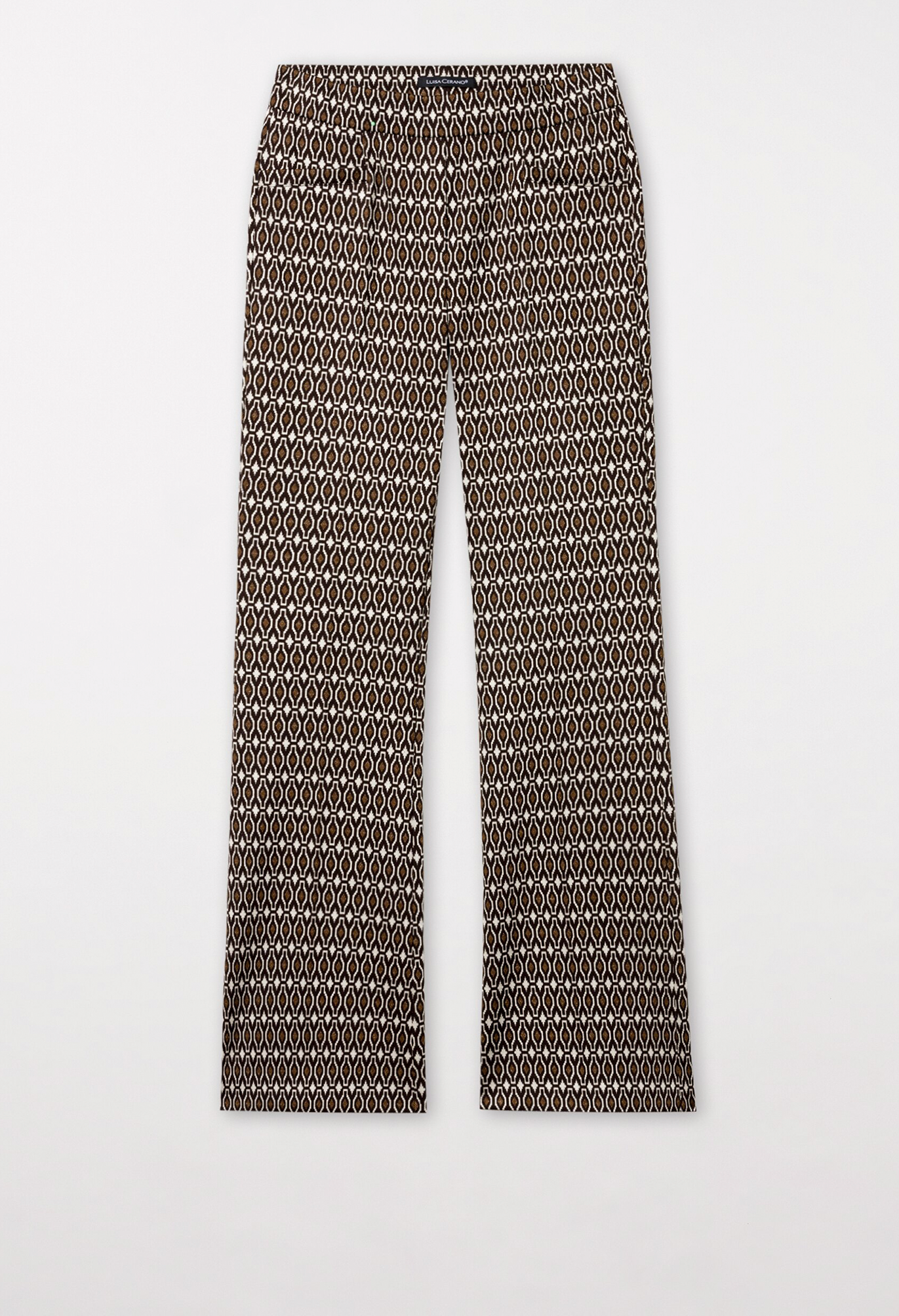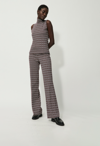 Элегантные расклешенные брюки из мягкого жаккардового джерси с эффектом блесток. Пояс и эластичный материал делают эти брюки особенно удобными.