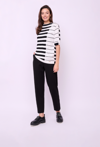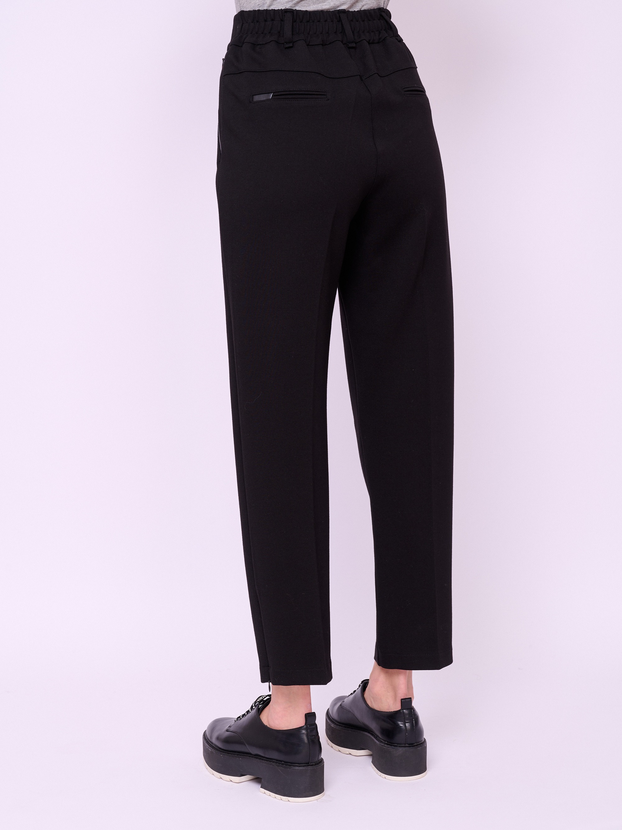Зауженные брюки из плотного, тяжелого трикотажа на молнии и резинке с прорезными карманами на молнии, стрелками и боковыми разрезами на молнии. Длина брючин: 76 см.