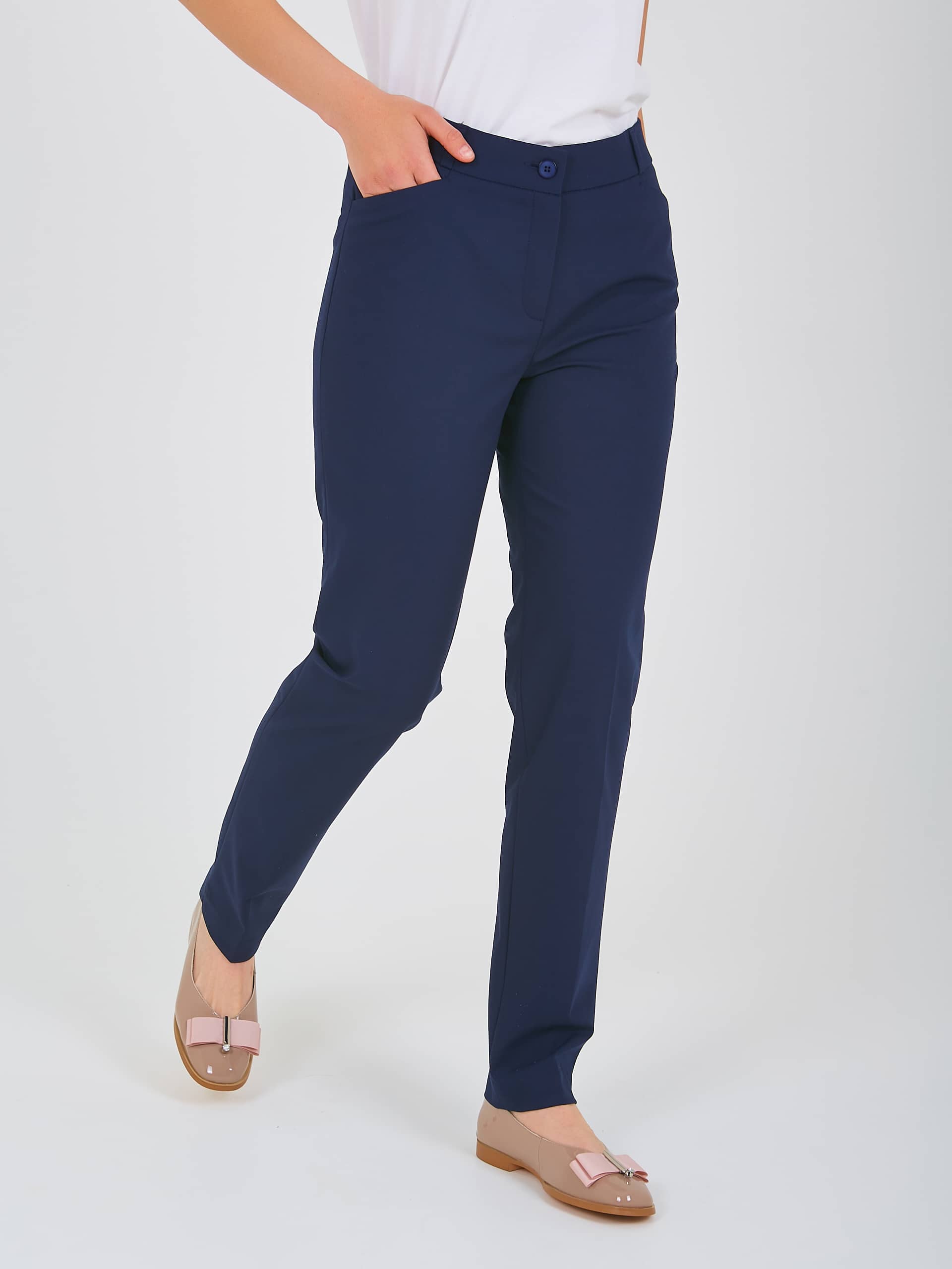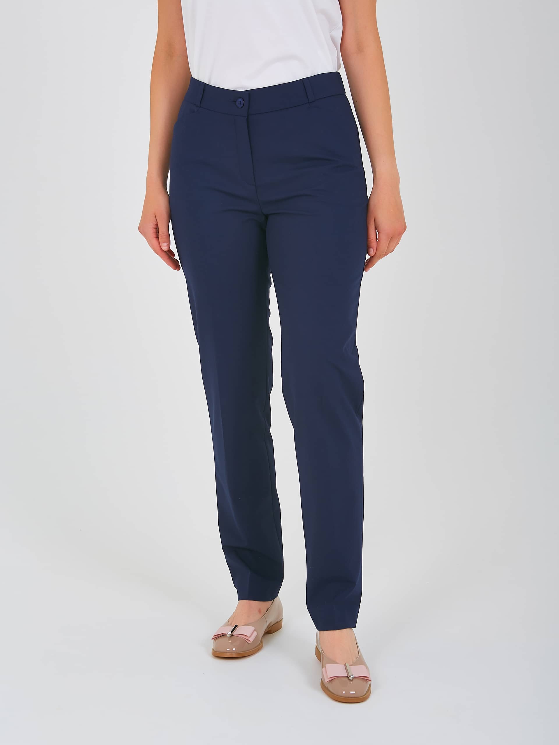 Прямые брюки с завышенной талией, длина 7/8, с застежкой на молнию и 1 пуговицу. Брюки слегка зауженные книзу. На передних половинках расположены два кармана с отрезным бочком. Вверх брюк обработан поясом на резинке со шлевками.