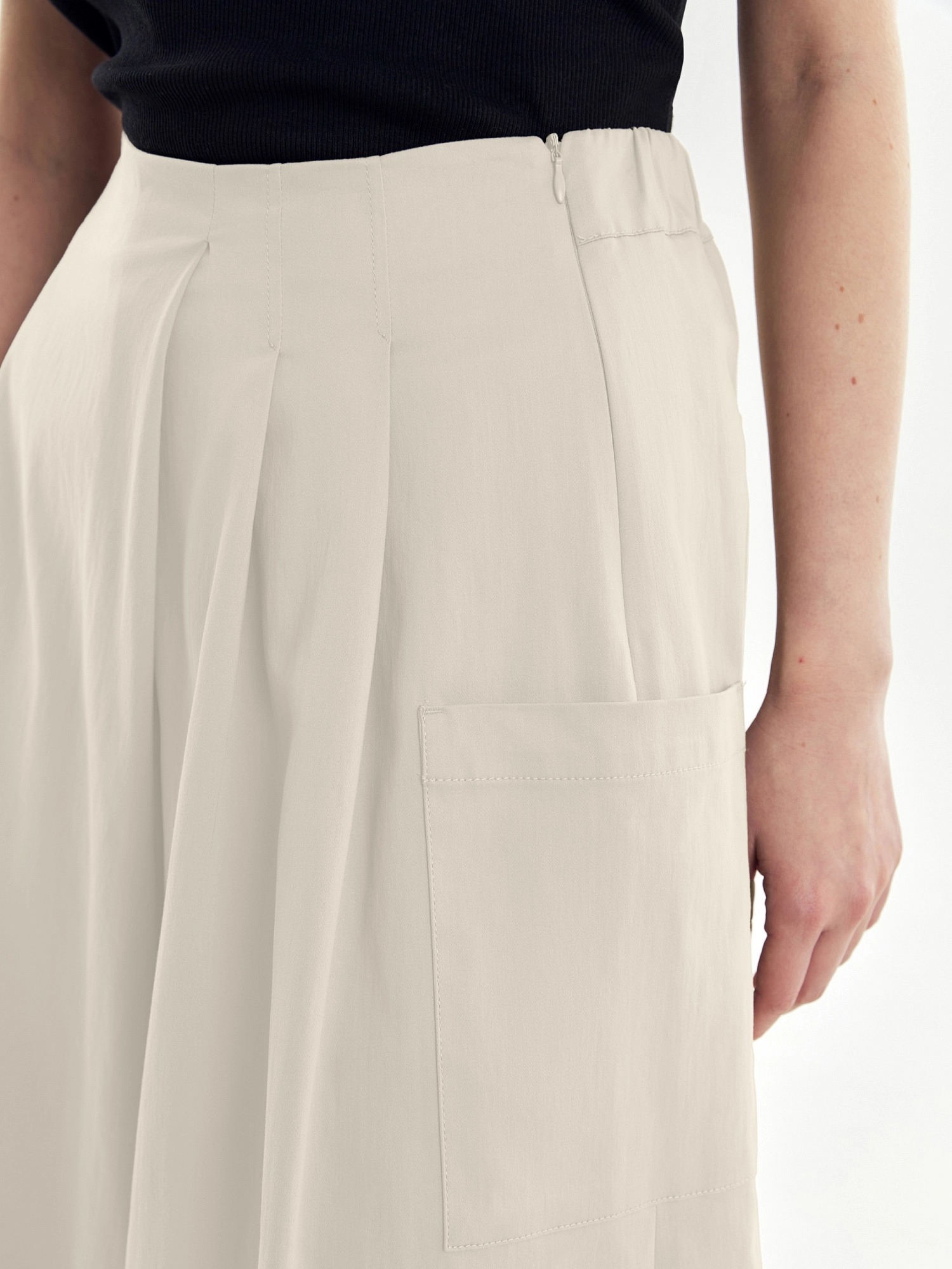 Длинные шорты из хлопковой ткани с запахом и складками по переду имитирующими юбку. На спинке резинка для лучшей посадки. Спереди складки, по бокам большие накладные карманы.