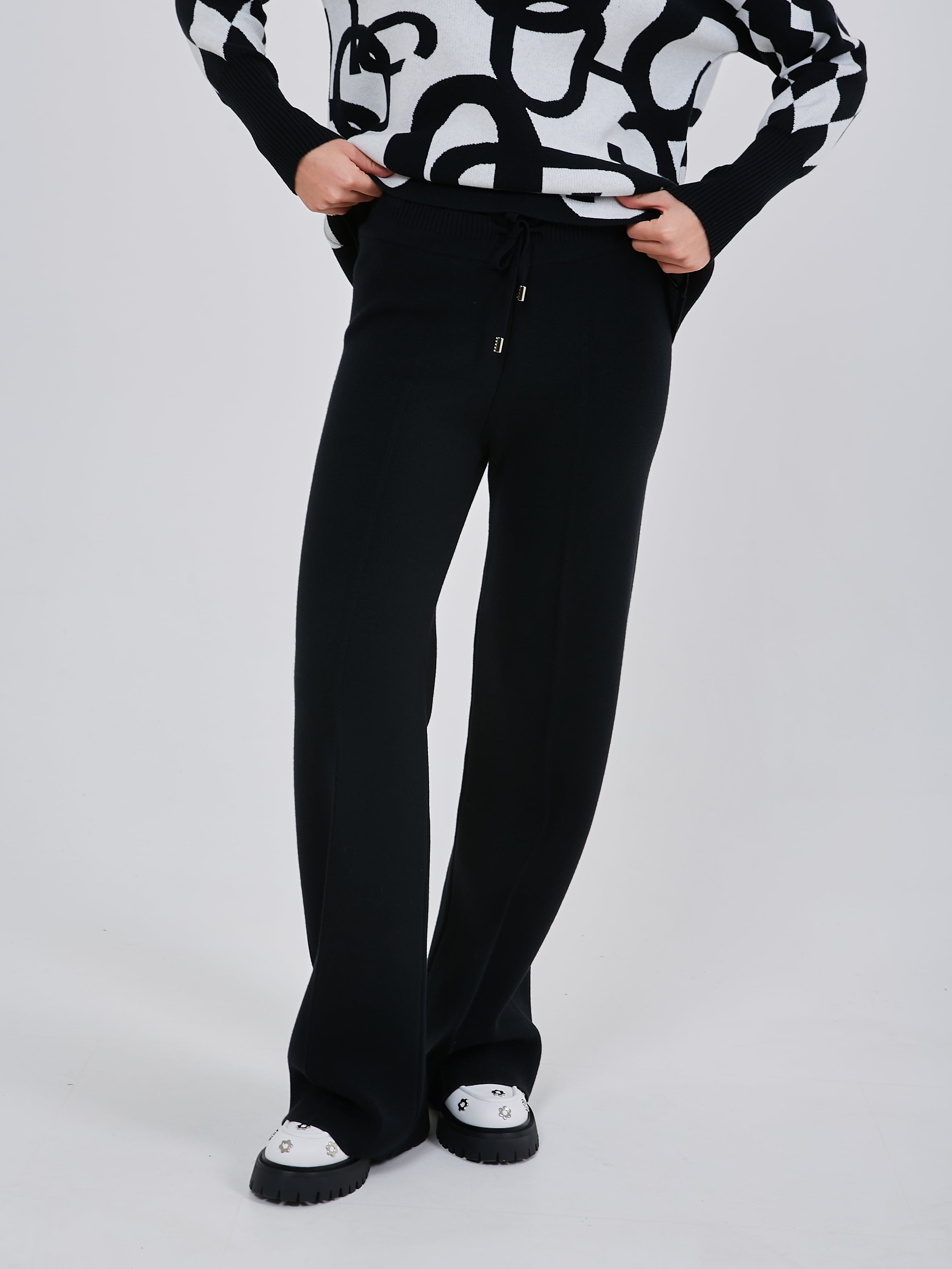Трикотажные брюки с комфортным поясом на шнурках, дополнены небольшой стрелкой, зрительно вытягивающей силуэт. Осень-Зима'25/26. Капсула "Малахитовая шкатулка"