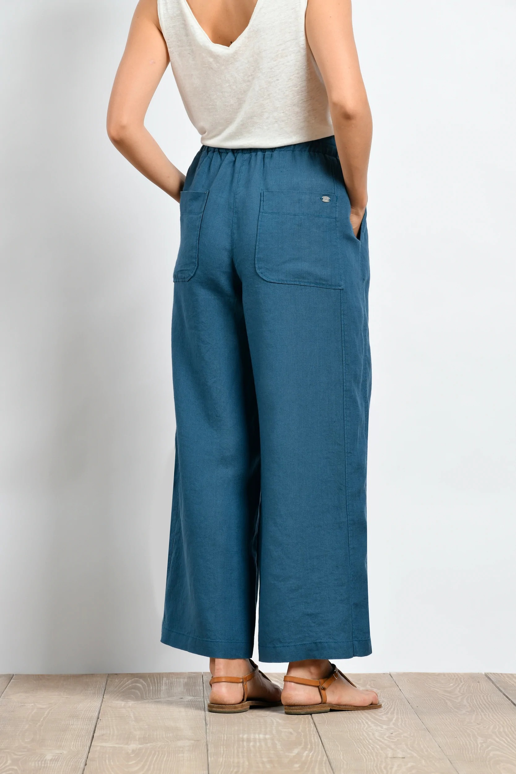 На сайте указаны Российские размеры. Льняные брюки широкого кроя с эластичным поясом.2 передних итальянских кармана. 2 накладных кармана с клапаном на пуговице сзади.