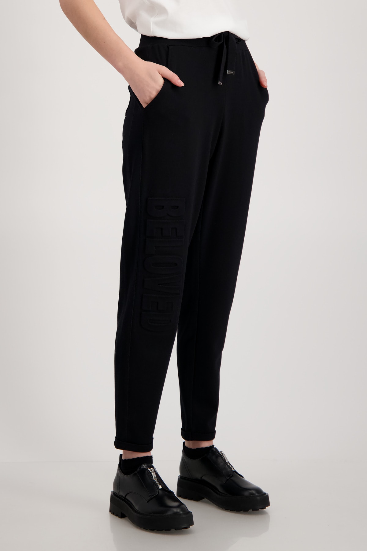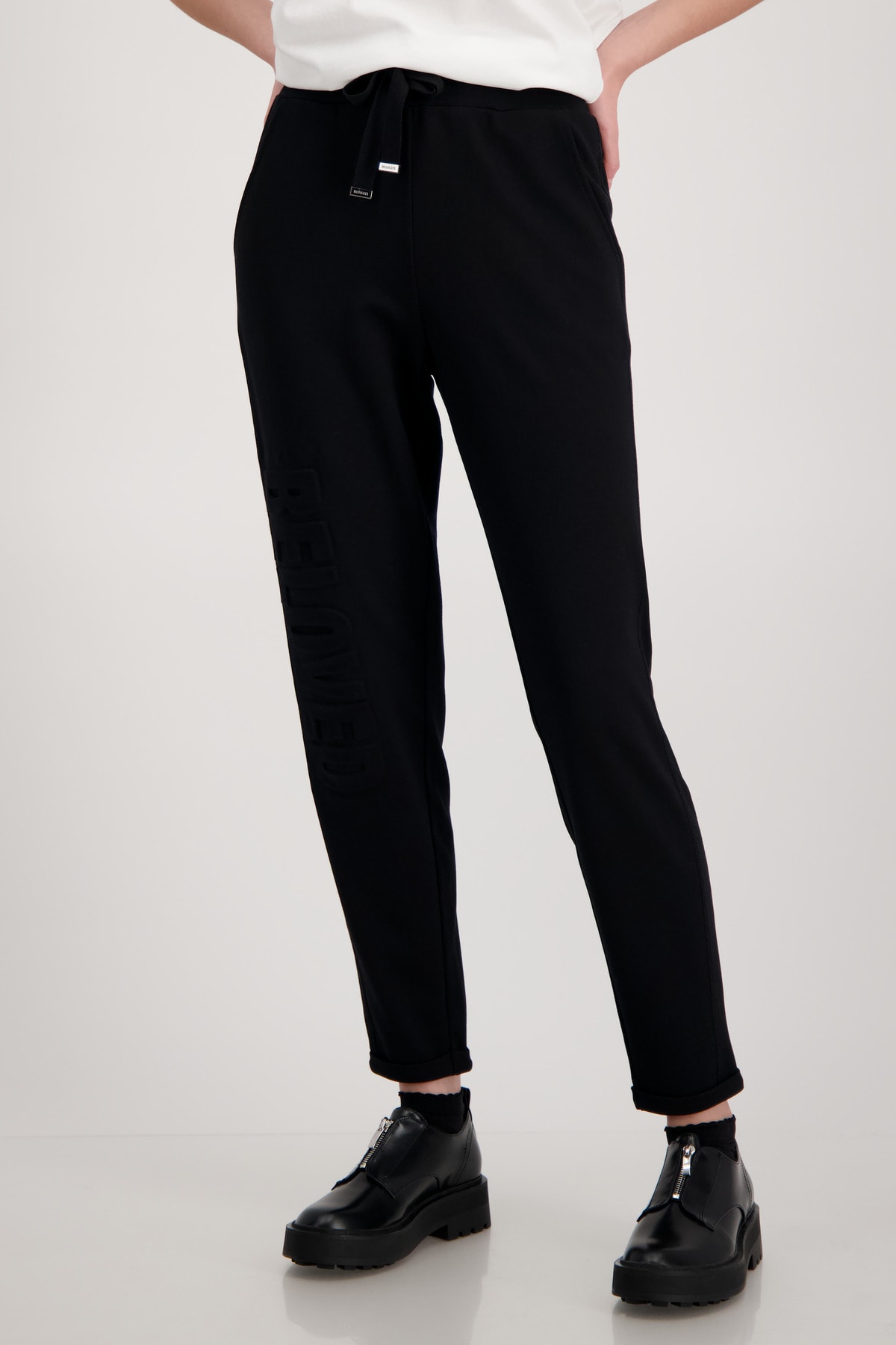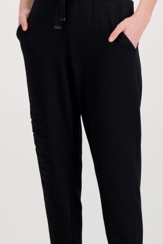 На сайте указаны российские размеры. Спортивные, элегантные и женственные: джоггеры от monari. Брюки выполнены из струящейся смесовой вискозы и обещают удобную посадку не только благодаря эластичности, но и благодаря повседневному крою с нормальной посадкой. Эластичный ребристый пояс с кулиской, люверсами и завязками, а также вставки из ткани в тон с оверлочными швами по бокам и боковые карманы стильно украшают модель. Тиснение тон в тон в виде объемной надписи определяет дизайн правой штанины и делает каждый ваш наряд изюминкой. Рост модели 178 см.