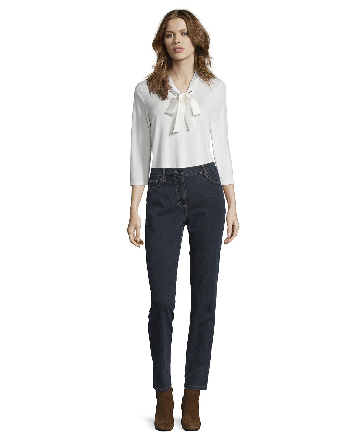 Джинсы прямого покроя - абсолютная классика современной моды! Материал из хопковой смеси практичен и приятен к телу. Однотонная модель без характерных джинсовых потертостей прекрасно сочетается как с футболкой, так и с блузой в романтическом стиле.