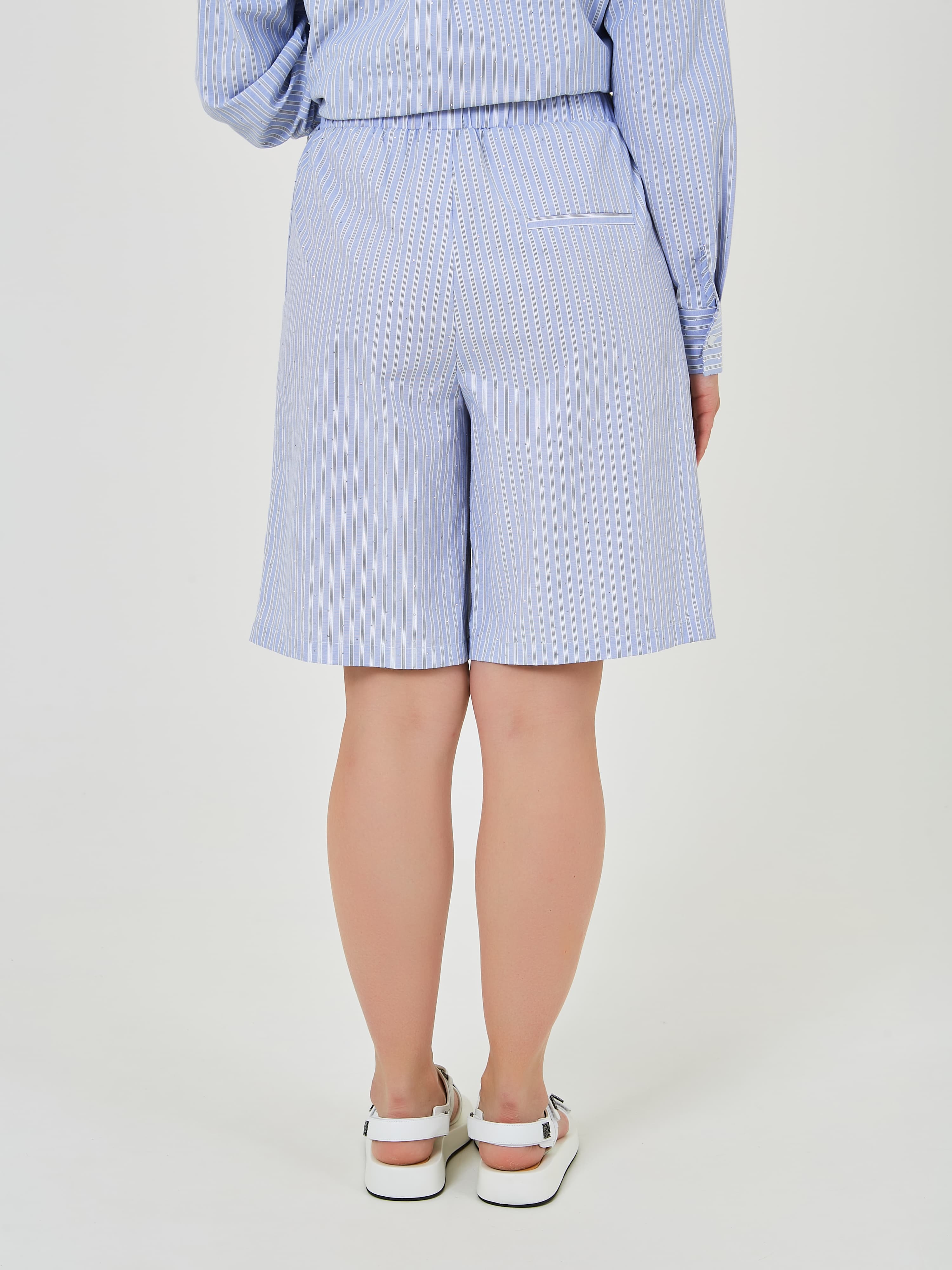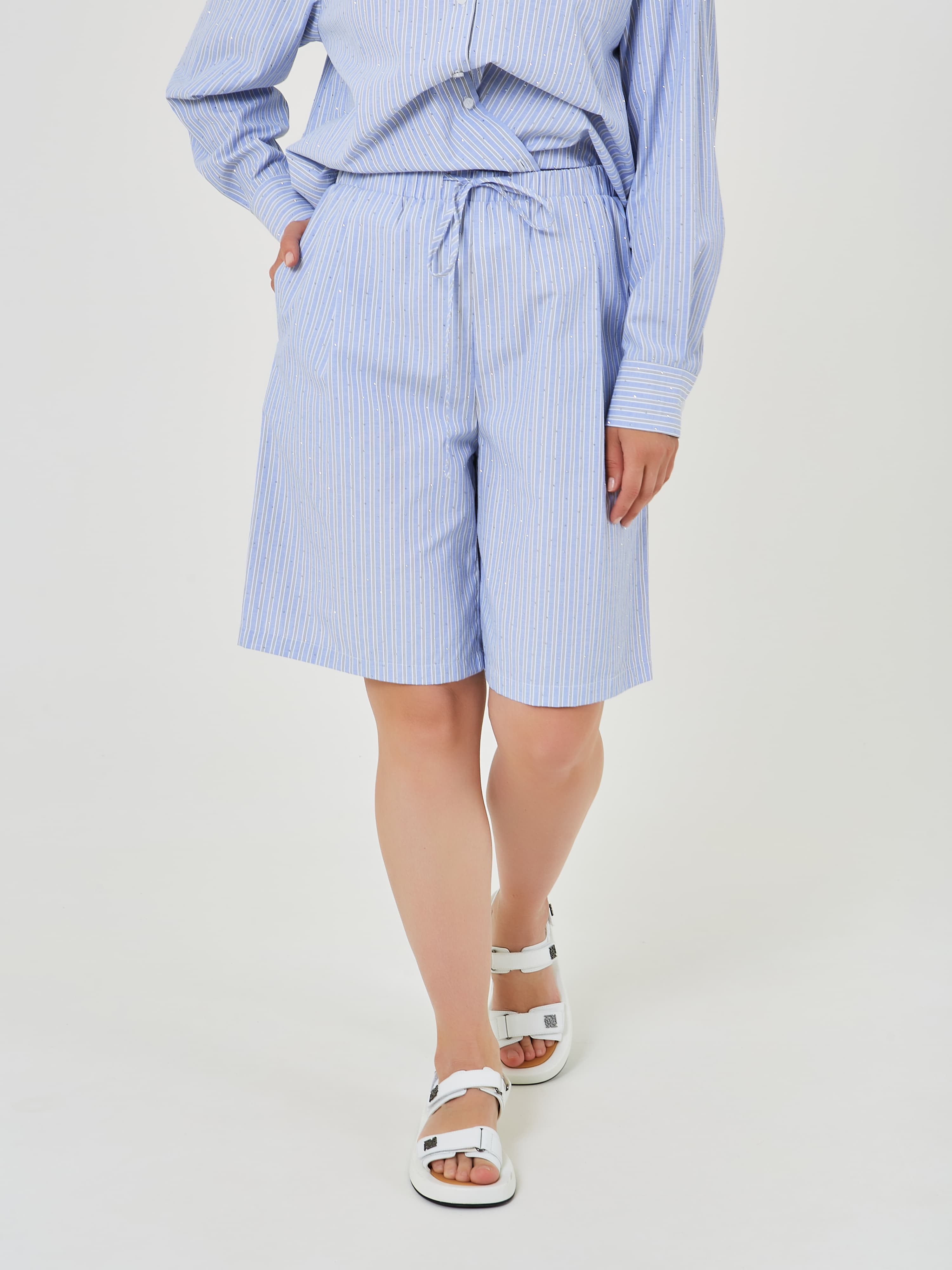 Шорты с эластичным поясом и завязками выполнены в светло-голубом цвете с тонкими вертикальными полосками и стразами, что придаёт им свежий и стильный вид. Коллекция Весна-Лето 2025. Капсула "Санторини". Параметры модели: 89-70-92, рост 167, размер 44-46