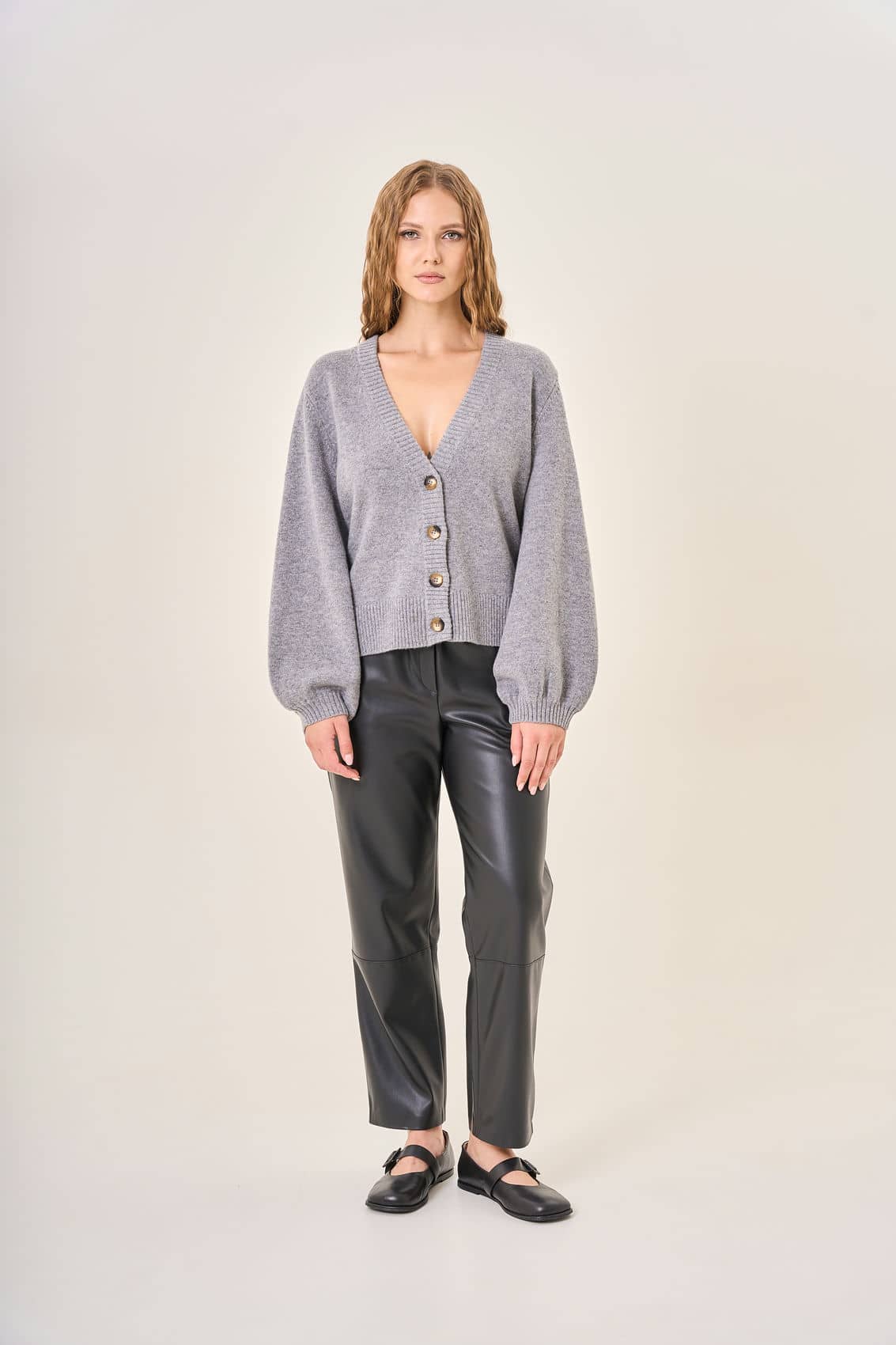 Черные штаны из эко-кожи на средней посадке. Эластичный пояс обеспечивает максимальный комфорт. Центральная строчка спереди создает элегантный акцент на коленях, подчеркивая стройность ног. Тщательно продуманная конструкция идеально садится на любую фигуру, подчеркивает достоинства и придает уверенности. Материал приятен к телу и сохраняет форму даже после многократных стирок. Осень-Зима'25/26. Капсула "Вишневый сад"