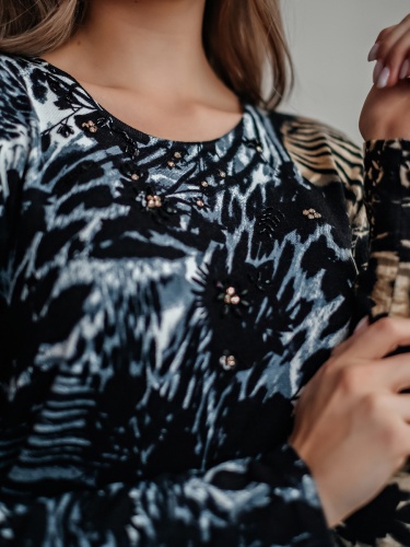 Теплый джемпер обращает на себя внимание благодаря цветочному принту в акварельном стиле. Прямой покрой, круглый вырез горловины, втачные рукава полной длины. Завершает изумительный дизайн декор из страз. Материал из вискозной смеси приятен к телу и обеспечивает комфорт.