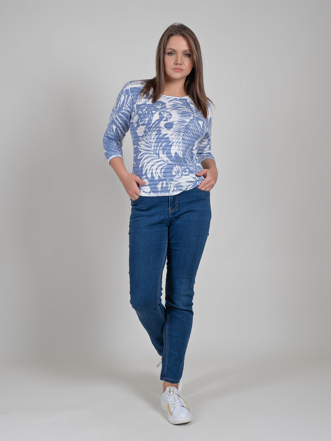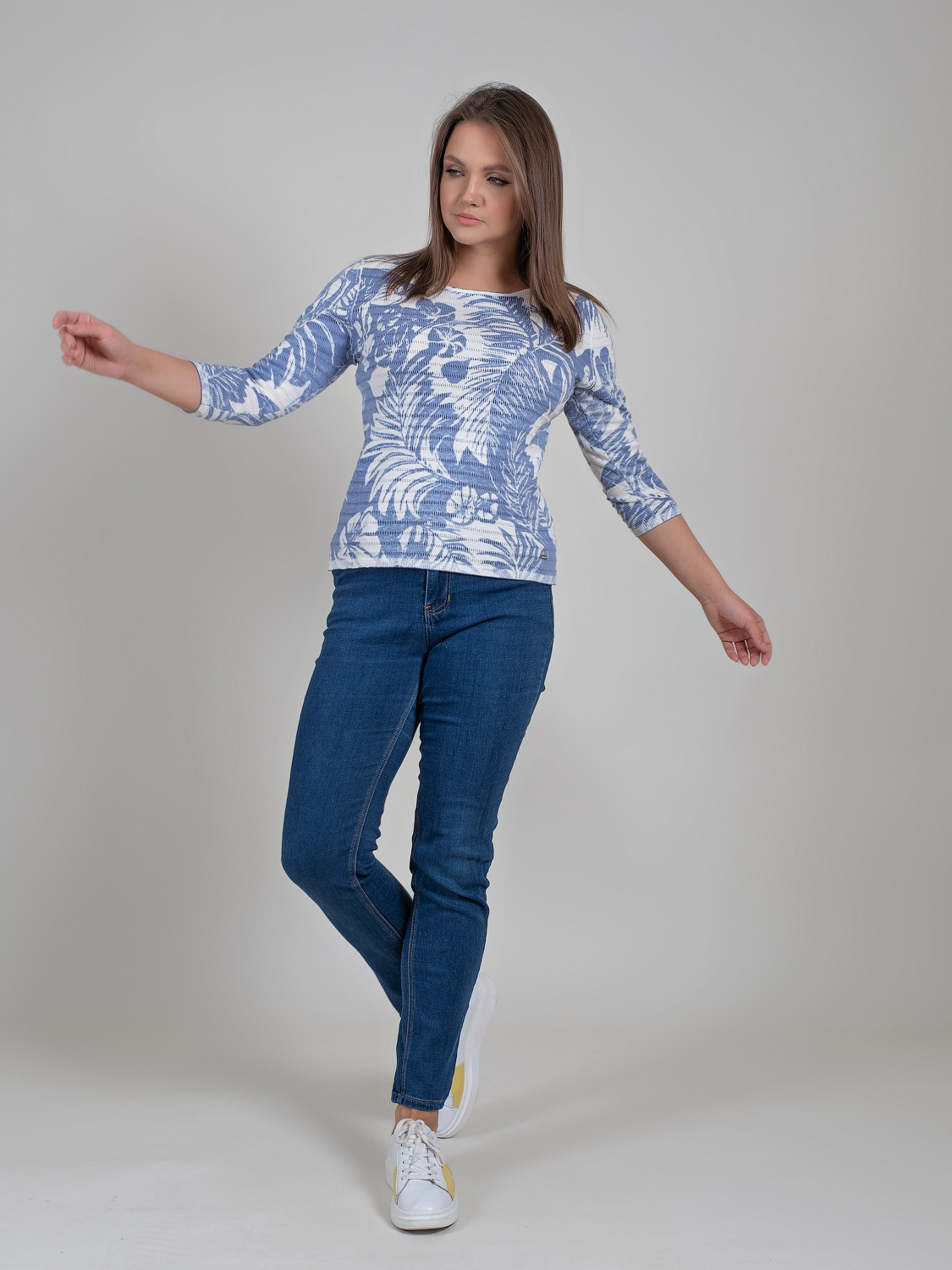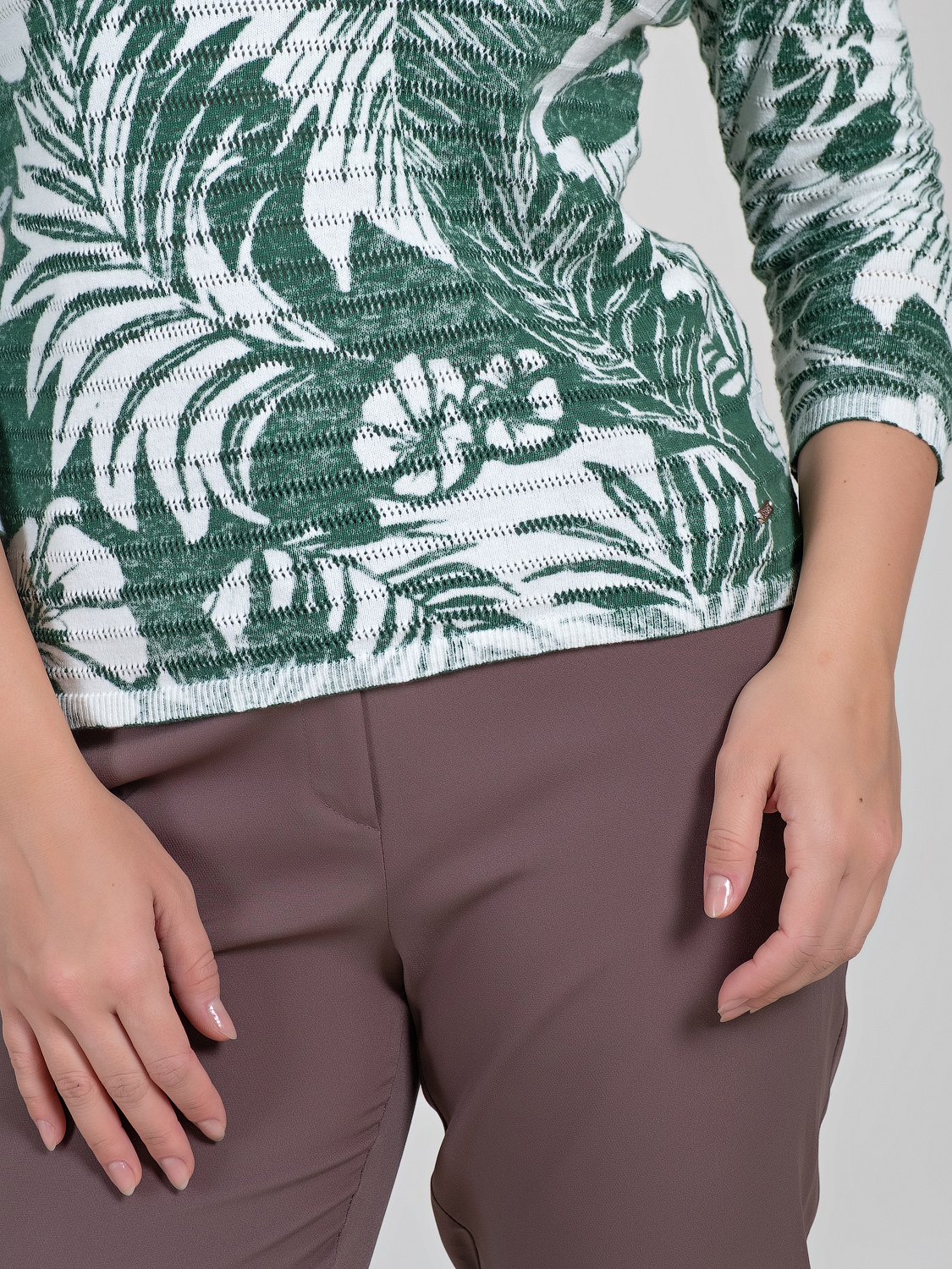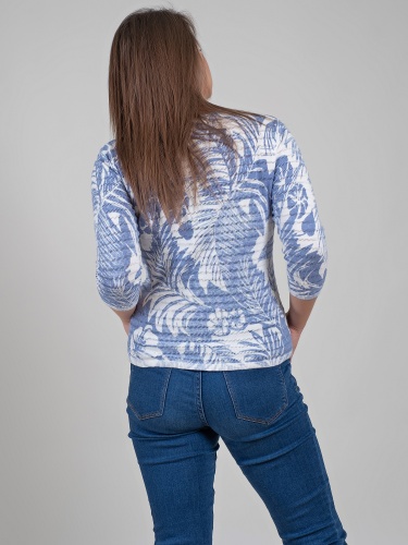 Легкий джемпер из 100%-го хлопка выполнен в тропическом узоре. Материал позволяет коже дышать, приятен к телу. Прямой крой скрывает недостатки фигуры и придает легкость силуэту. Втачной рукав 3\4 оголяет предплечья и визуально стройнит силуэт. Горловина-лодочка выгодно подчеркивает изящество линии шеи. Футболку можно как заправить под юбку или брюки, так и носить навыпуск.