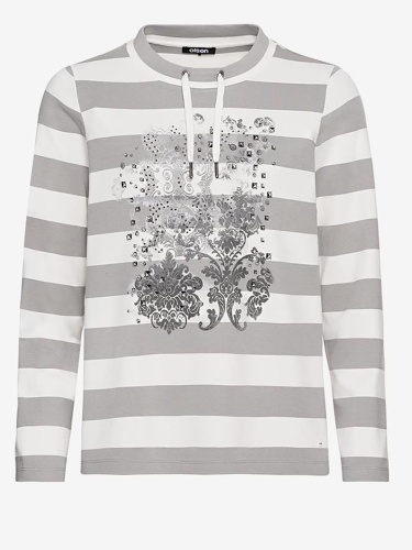 .Джемпер прямого кроя в широкую бело-серую полоску. Прямой силуэт, круглый вырез горловины. Спереди изящный, женственный узор.