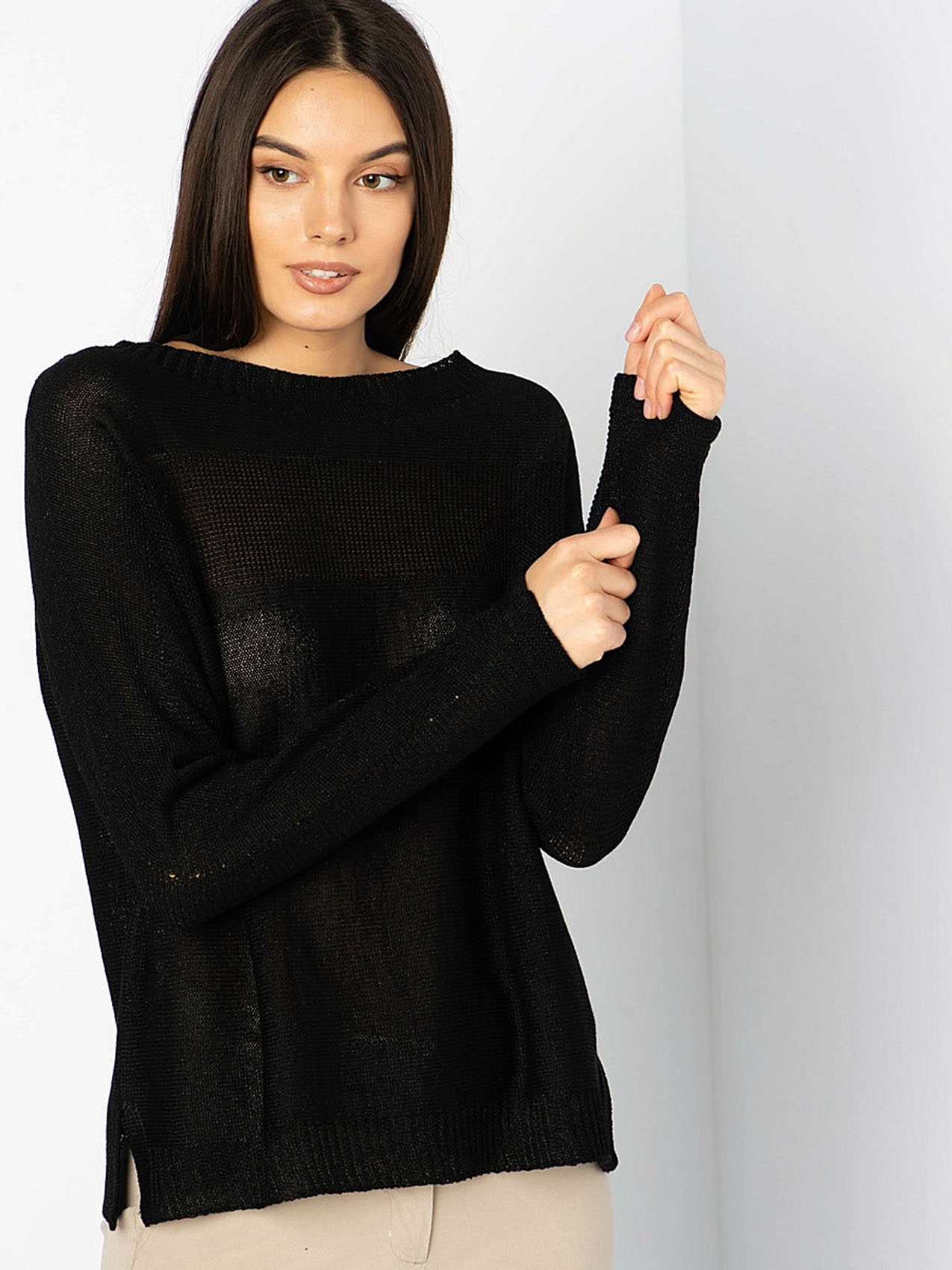 Приятный к телу джемпер из вискозы и полиэстера. Свободный покрой. Вырез "лодочка", длинные рукава. Небольшие разрезы по бокам. Длина изделия по спинке: 65 см.
