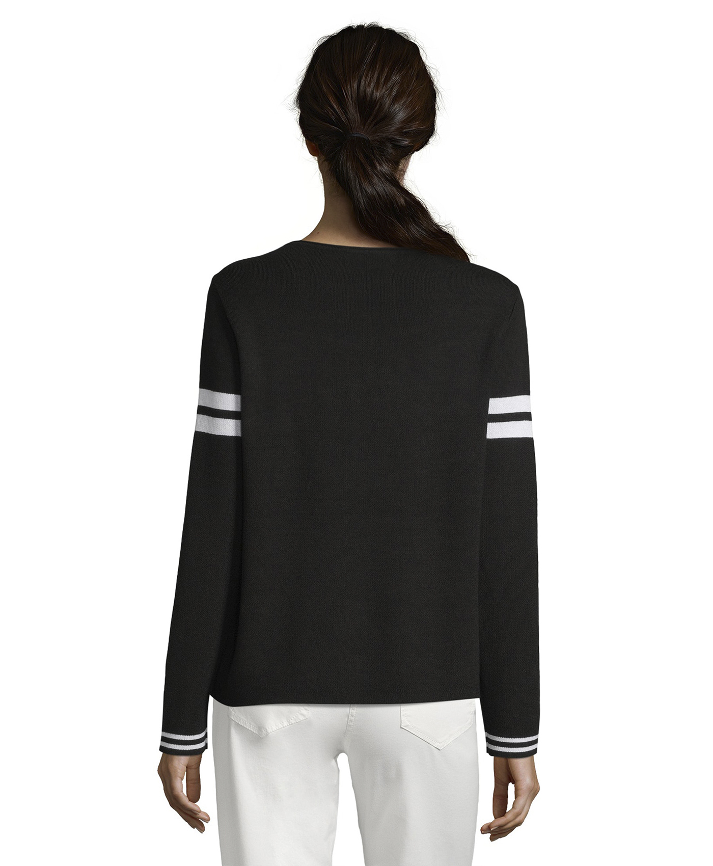 Необычное сочетание цветов, надписи и полоски, и все в одной вещи! Поэтому черно-белый дизайн совсем не выглядит скучно. Джемпер прямого покроя с длинными рукавами и вырезом горловины "лодочка". Материал из хлопково-вискозной смеси приятен к телу и обеспечивает комфорт. Этот джемпер - отличный выбор для прогулки прохладным летним вечером.