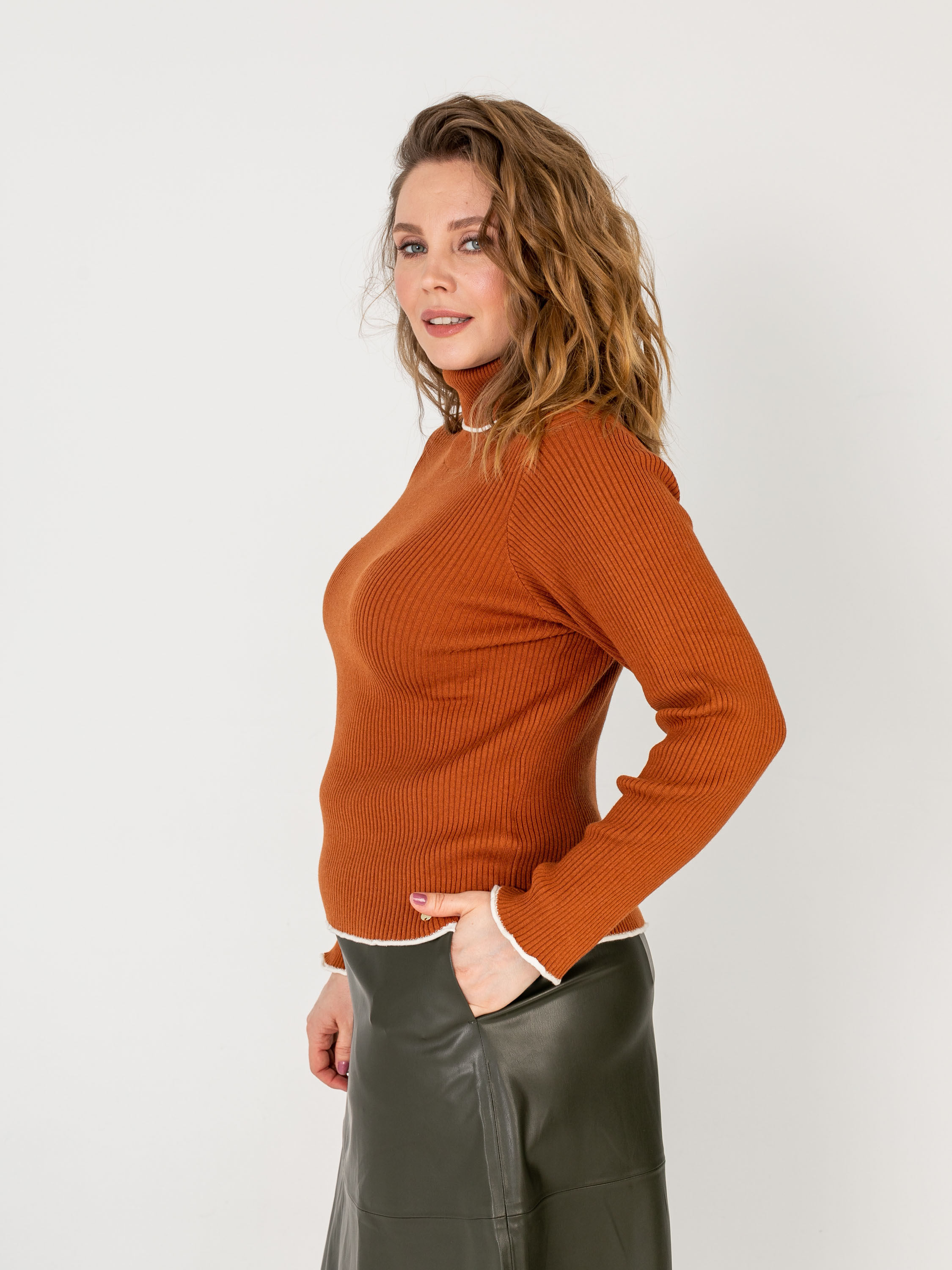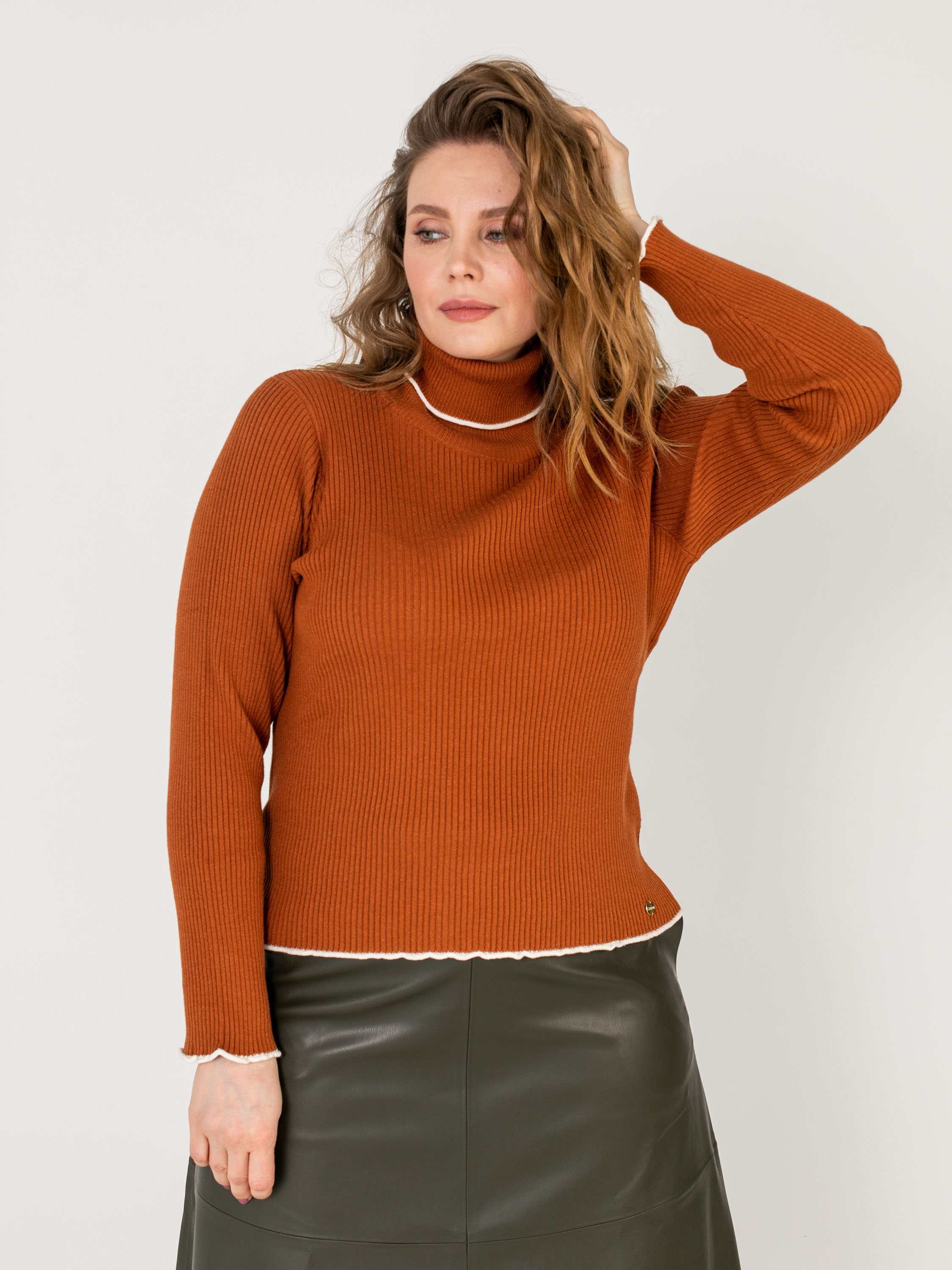 На сайте указаны российские размеры. Ткань: 50% хлопок, 50% акрил. Крой: однотонный джемпер-водолазка с высоким горлом в мелкий рубчик. Приталенный силуэт подчеркивает красоту фигуры, но благодаря достаточной плотности материала ее возможные недостатки не выглядят так явно. Прикрывает зону живота, не поднимается вверх при движении. Джемпер представлен в двух стильных оттенках – кирпичном и синем электрик. Отделка: ворот и рукава отделаны белой волнистой канвой, которая смотрится свежо и контрастно. Идеальный партнер для синих джинсов или темных брюк из коллекции Stern.