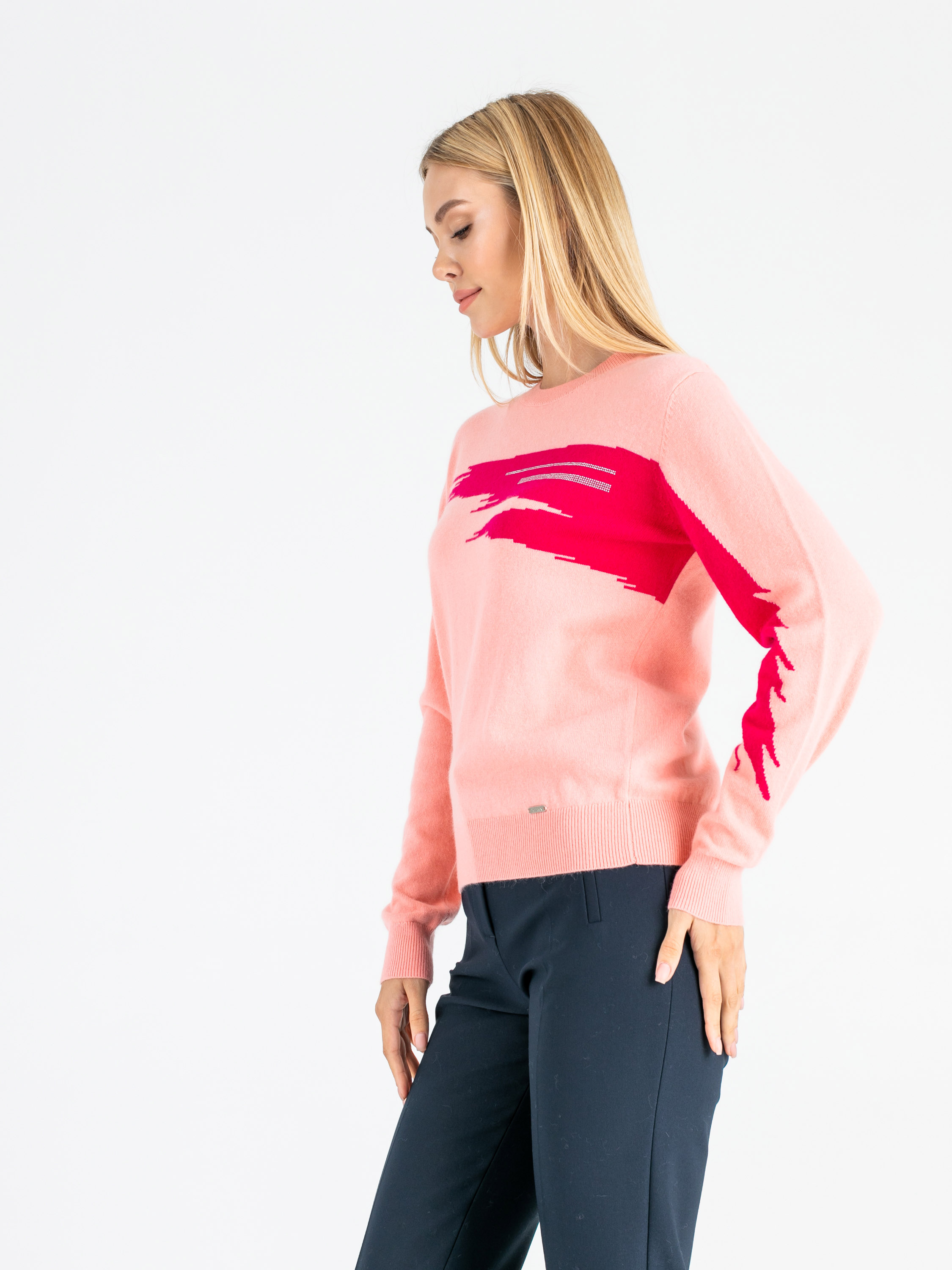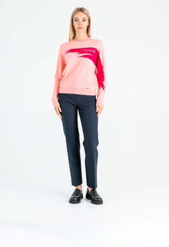На сайте указаны российские размеры. Ткань: смесовая ткань средней плотности. В составе: 27% вискоза, 27% нейлон, 23% ангора, 23% шерсть. Крой: джемпер слегка приталенного силуэта с круглым вырезом и длинным рукавом. Комфортный материал, где за мягкость отвечает вискоза, а за тепло – ангора и шерсть. Резинки на манжетах и конце изделия обеспечивают надежное прилегание, Резинки на манжетах и конце изделия обеспечивают надежное прилегание, не открывают зону живота, что особенно актуально в холодное время года. Представлен в двух стильных оттенках – голубом и розовом. Отделка: художественная абстракция может восприниматься по-разному: для одних это мазок кисти художника, для других – хвост кометы. Небольшая дорожка страз добавляет звёздного сияния, делая вас – главной звездой этого дня. Джемпер украшен фирменным шильдиком. С коллекцией брюк и юбок для создания образа с джемпером можно познакомиться в соответствующих разделах нашего сайта. Рост модели - 177 см