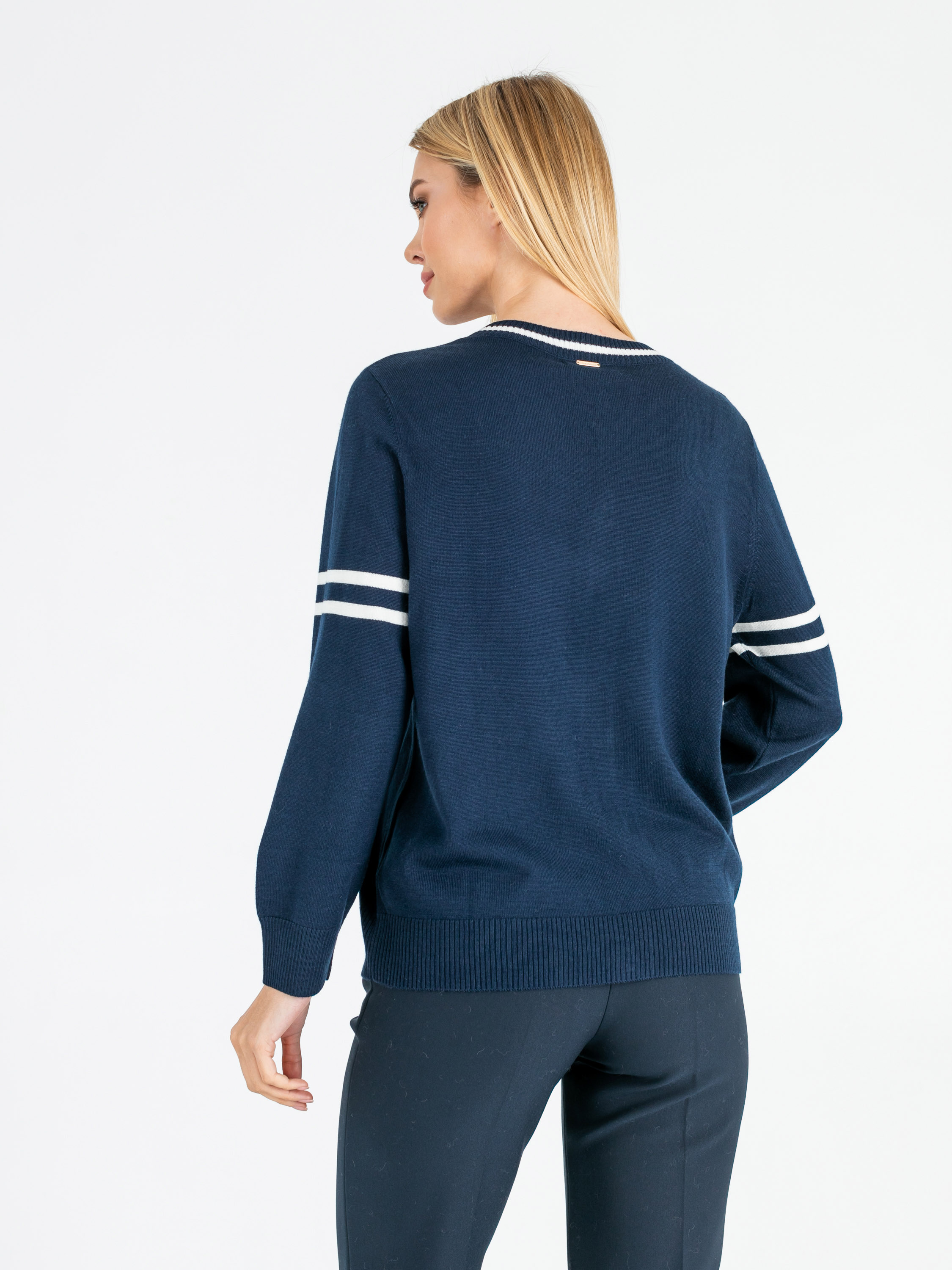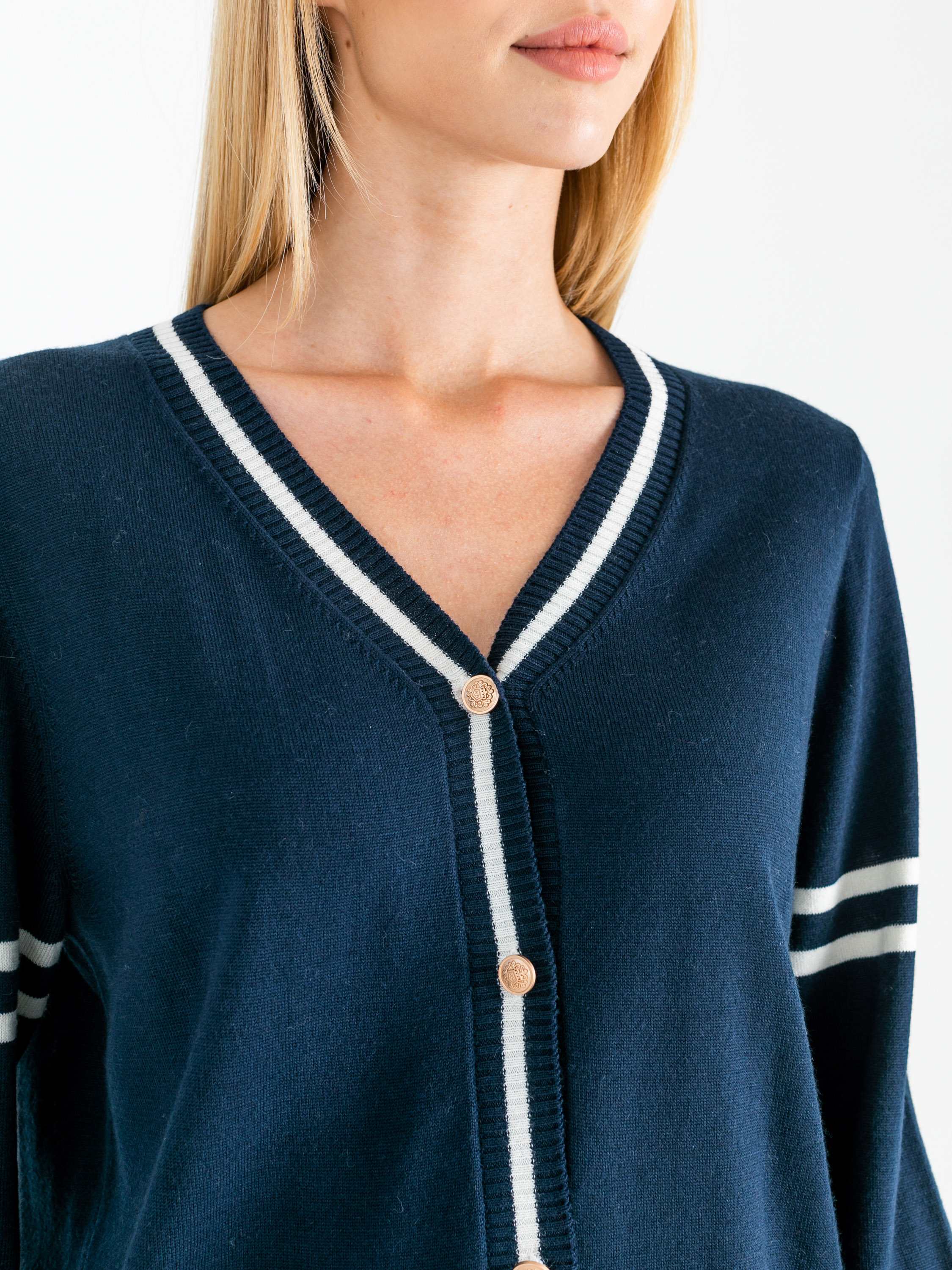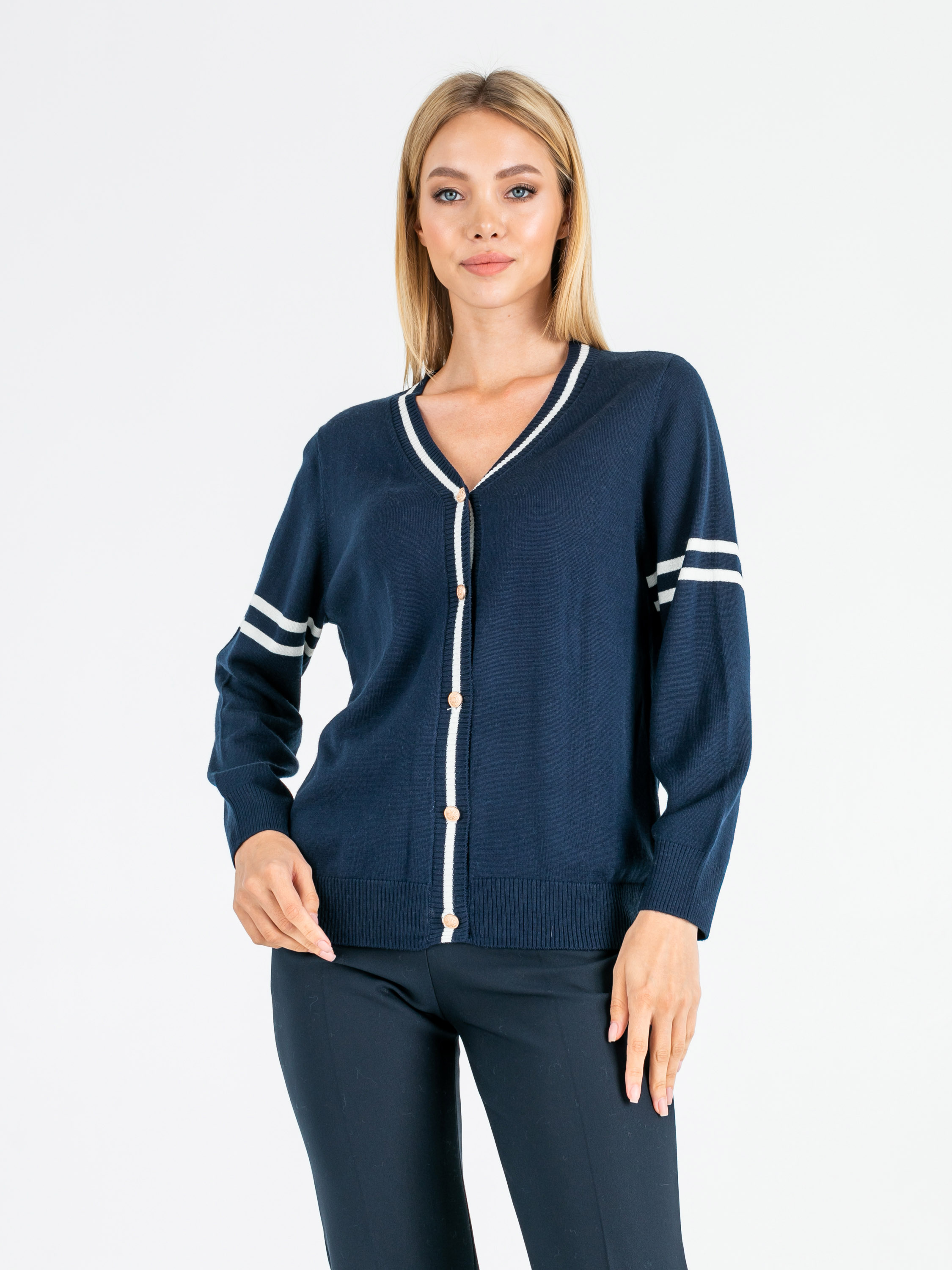 На сайте указаны российские размеры. Ткань: выполнен из мягкого и уютного материала – смеси шерсти и акрила. Крой: прямой силуэт, благородный темно-синий цвет и изысканный V-образный вырез делают этот кардиган лучшим вложением в стильный гардероб. Пуговицы – функциональны, а значит, можно носить кардиган как в застегнутом, так и в расстегнутом виде. Длина рукава с манжетом-резинкой регулируется до желаемого уровня. Отделка: кардиган в стиле casual со спортивными элементами – контрастными полосками, которые моментально делают образ запоминающимся. Золотистые фактурные пуговицы с оттиском добавляют шика и приковывают внимание к себе. На спине расположен фирменный шильдик-эмблема. Кардиган может выступать как самостоятельная деталь одежды, так и служить компаньоном для водолазки, футболки, блузки и рубашки из ассортимента Stern. Рост модели - 177 см