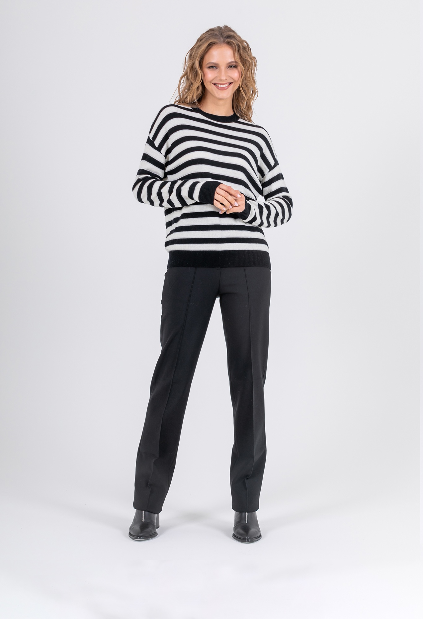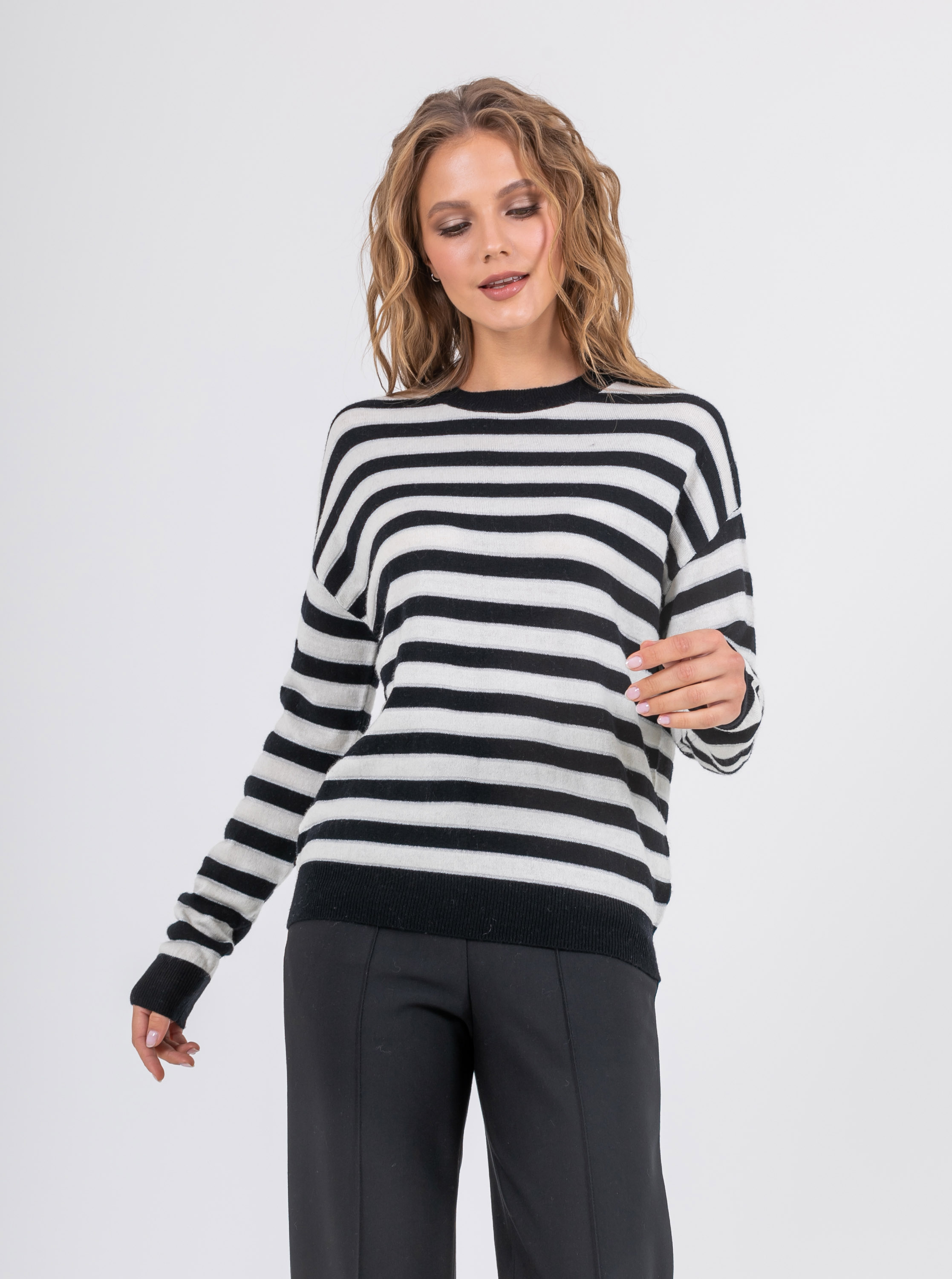 На сайте указаны российские размеры. Ткань: выполнен из 100% шерсти, которая прекрасно сохраняет тепло, пропускает воздух и впитывает влагу. Крой: классическая удлиненная модель свободного силуэта с длинными рукавами и круглым горлом. Слегка опущенная зона рукава обеспечивает максимальный комфорт и свободу при движении. Универсальная модель, подходящая женщинам с разным типом фигур. Отделка: отделка резинкой на манжетах и низе джемпера обеспечивает плотное прилегание, изделие не поднимается вверх и не открывает зону живота. Джемпер из мягкой шерсти в классическую черно-белую полоску создает французский шик. Прекрасно сочетается с джинсами, классическими и зауженными брюками, юбками А-силуэта и юбками-карандаш, шортами и кюлотами.